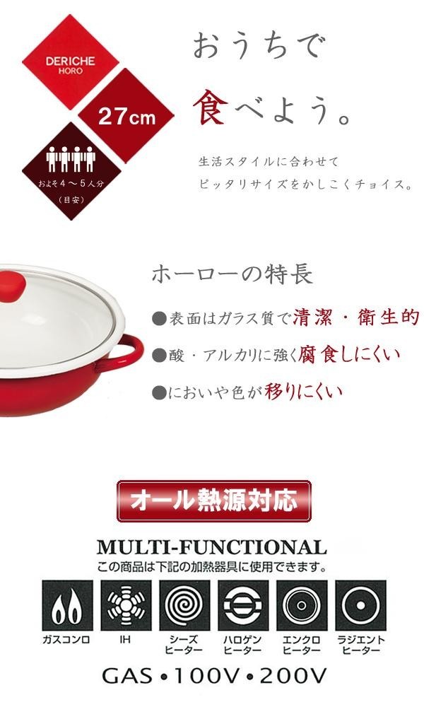 | 仕様 | オール熱源対応(ガス、IH100V・200V、シーズヒーター、ハロゲンヒーター、エンクロヒーター、ラジエントヒーター) 食洗機・乾燥機不可 およそ4~5人分(目安) |