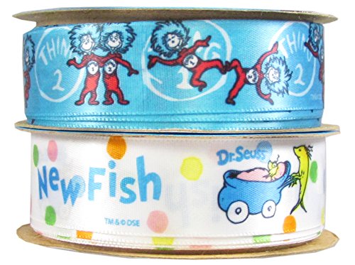 Offray Dr. Seuss Craft Ribbon: 18 Feet 7/8 Inch Satin Fabric Craft Ribbon For Gift Package Wrapping,Hairbow Clips,Sewing,Wedding,Scrapbook,Boy Girl Baby Shower-(2x3yd Thing One Thing Two New Fish)