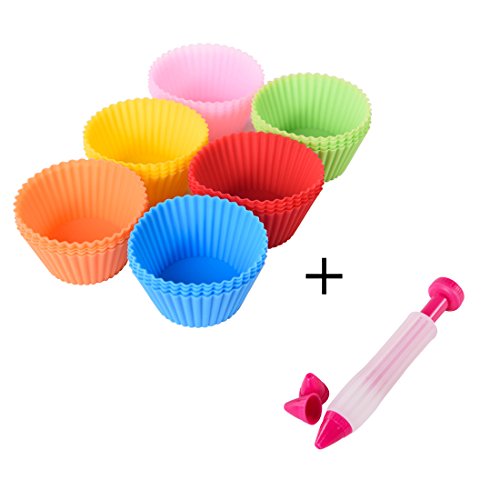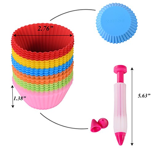 PERFECT COLLECTION - 24pcs silicone muffin cups and 1pc silicone cake decorating pen. The size of muffin cup is 2.76*2.76*1.38 inch, and the decorating pen is 5.63*1.38*1.38 inch
