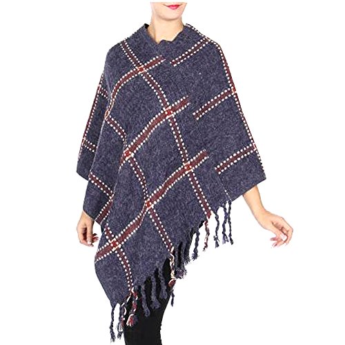 Product Description This knit poncho in diamond pattern will provide the comfort and style you need for the cold month of fall. The stylish poncho features tassels. It comes in navy with square contrast pattern. 0