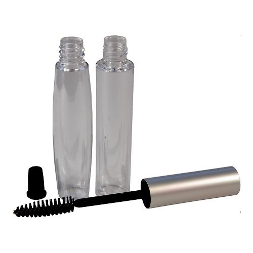 Description: Plastic cylinder round container with screw cap. Transparent body, silver cap, applicator with small brush. Holds 8 ml (0.25 floz). Use: For mascara.