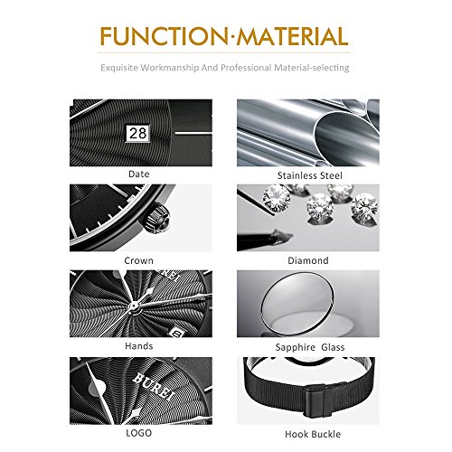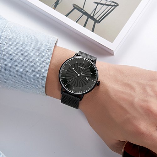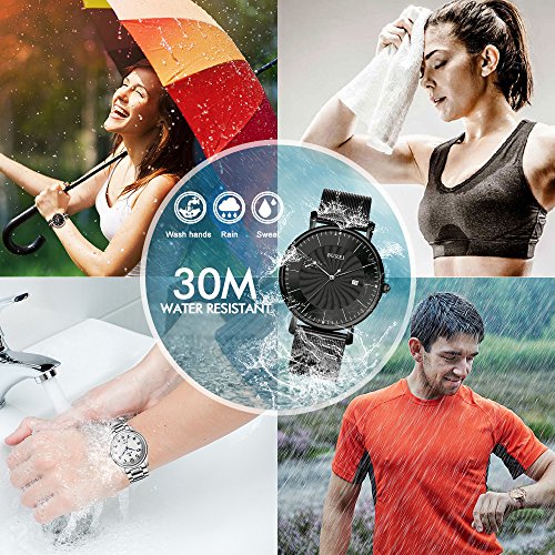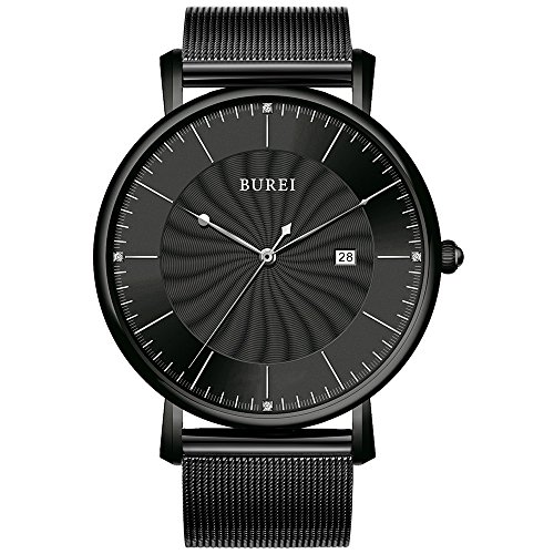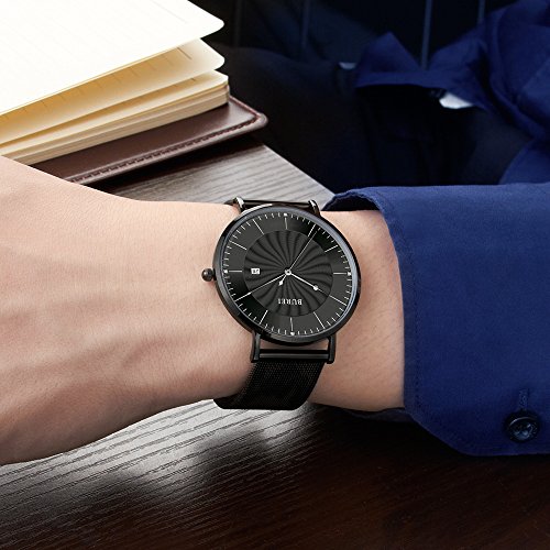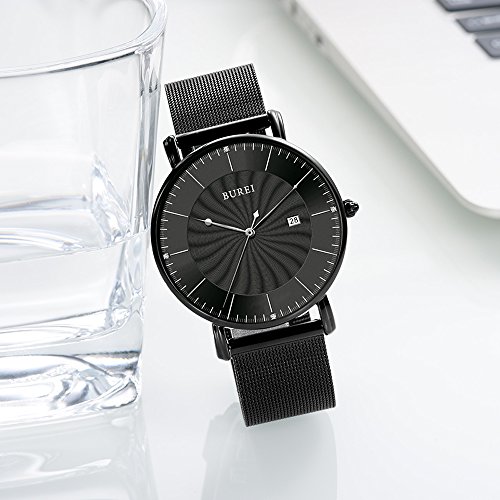BUREI Unisex Ultra Thin Analogue Quartz Watches with Stylish Face Date Calendar Mineral Crystal Milanese Band