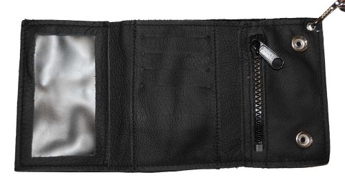 -. Feature : Features 1 ID slot, 3 credit card slot, 1 cash slot and one zippered pocket / Removable 14" Chain and Two Snap Closure / Metal Bar & Shield Medallion / Made in the USA! / Measures: 4.5" x 3"