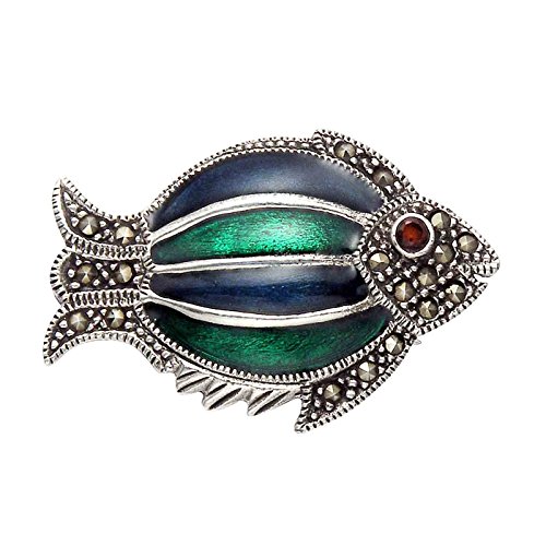 -. Title : Sterling Silver & Marcasite Fish Pin w/Blue, Green Enamel & Red Crystal Eye