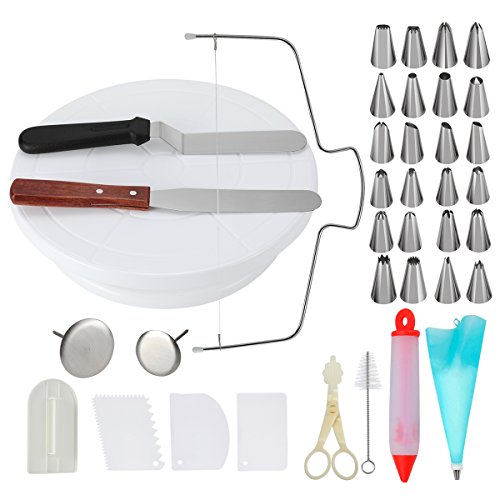 - Cake decorating supplies: Cake Turntable,Cake Leveler, 2 Angled Icing SpatulaIcing 24 stainless steel icing tips, 1 reusable silicone pastry bag, 2 reusable plastic couplers, 2 flower nails,1 Cake Pen,3 Cake Cutter 1 Cake Smoother with which you can create all types of patterns on cake, cupcakes