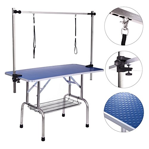 Top High quality Non-slip pure rubber matting , scrap resistant and easy to clean. Static-free board so hair and debris do not stick and can be easily cleaned and wiped down. Waterproof 7-Layer sealed to stop damp entering the plywood top for a long trouble free use. Deluxe aluminum edging. featured design support brackets so will take the heaviest of dogs. Steel reinforced rubber caps make the table ultra stable. Heavy Duty Stainless steel Folding Legs,will not rust or corrode like chrome. Folds for easy storage and can easily be carried so ideal for mobile groomers etc. Will take the heaviest of dog with out a problem due to the design support brackets and heavy duty folding leg. Color: Silver Base With Blue Table Table Dimension: 36'X 24' X 0.8' (L X W X Thickness) Whole Unit Dimension: 36'X 24'X 64'(L X W X H) Size Of The Mesh Tray: 25.6'X 12.6'(L X W) Material: Stainless Steel Frame And Anti-slip Rubber Table Surface Length of Noose:20.5' Unit Weight: 33 Lbs Weight Capacity: 250 Lbs Package Includes: 1 X Grooming Table 2 X Adjustable Arm 1 X Adjustable Overhead Arm 2 X Noose 1 X Mesh Tray 0