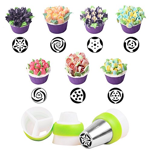 7 LARGE STAINLESS STEEL RUSSIAN TIPS: This tips have seven different flower pattern, each one is made of high quality and food grade stainless steel materials, very durable, don't rust. It's smooth surface is easy to clean, dishwasher safe.