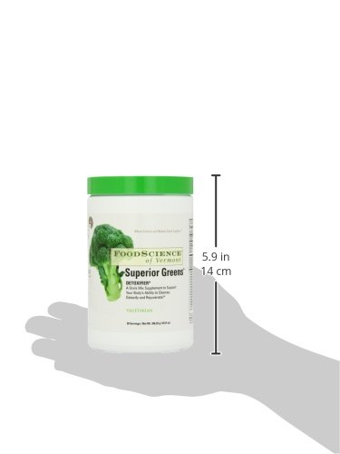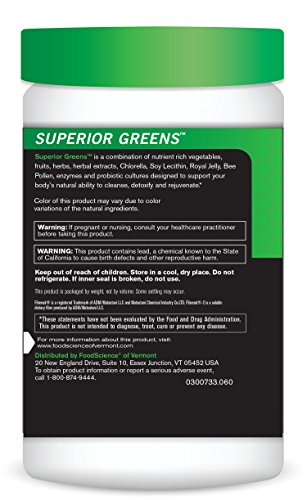 Studio : Food Science of Vermont Publisher : Food Science of Vermont Binding : Health and Beauty Product Description Superior Greens is a combination of nutrient rich vegetables, fruits, herbs, herbal extracts, Chlorella, Soy Lecithin, Royal Jelly, Bee Pollen, enzymes and probiotic cultures designed to support your body’s natural ability to cleanse, detoxify and rejuvenate. We have also included our proprietary Immune System Support Blend that includes DMG. FoodScience of Vermont has been studying the benefits of DMG for over 40 years and holds several patents with regard to the use of this beneficial amino acid. Superior Greens can be easily mixed in cold water, juice or smoothies and has a pleasant apple cinnamon flavor. Each container holds 60 servings. 0
