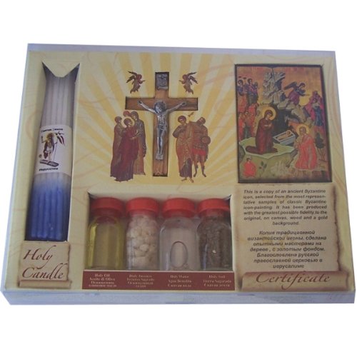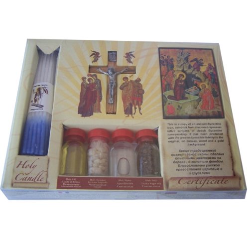 Samples include Holy Water from the Jordan river, Earth from Jerusalem, Virgin olive oil from Bethlehem and Frankincense from the Holy land. It has also an Icon and a 33-candles set amd a top quality olive wood Crucifix..