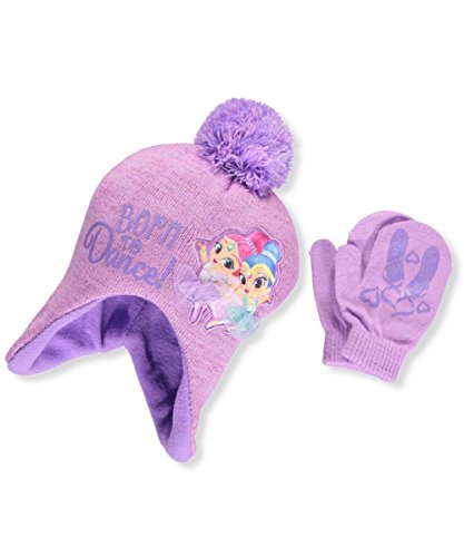 Studio : Simmer And Shine Publisher : Simmer And Shine Binding : Apparel Product Description Your Shimmer and Shine fan will love the cozy comfort and fun accents of this beanie and mittens set! Shimmer And Shine beanie and mittens set Acrylic knit earflap beanie with glittery thread accents, pom pom, fleece lining, and character applique with tulle accents (beanie 100% acrylic; lining 100% polyester) Acrylic knit mittens (100% acrylic) Hand wash cold Imported 0