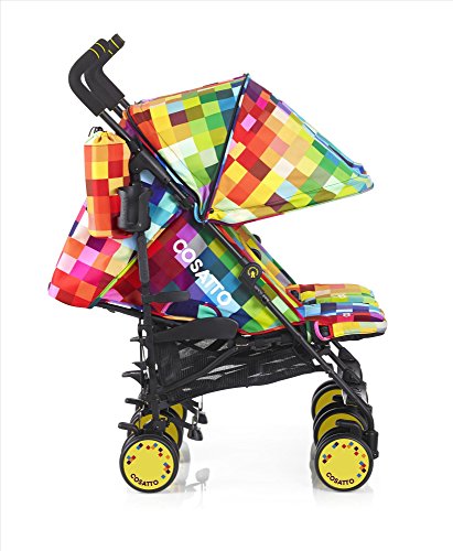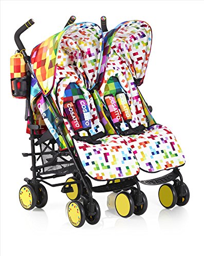 Pixel Pzazz - Like a lucky dip color combo, Cosatto have launched a million multicolor squares into space and they've landed on Supa Dupa Pixelate twin pushchair. Got plural pixies? Think Supa Pixelate, then escalate. Supa Dupa double stroller is the feature king of twin pushchairs; with easy-clean pop-off seat units, multimedia pockets for gadget gazing and folded upright storage. With cup holder, one-handed recline, big basket, luxury leg rest, Cozy Kits and Cozy Toes, this umbrella-fold twin stroller is the pixel pick of the buggy bunch. Play pixel pop through the built-in speaker and screen out the nosy sun with the extendable sunshade. Those pesky pixels have even sneaked onto the adjustable two-tone sport handles and yellow wheel rims. There's a FREE 4 year guarantee and a pixelated 'it' bag to really turn up the Cosatto contrast. Make like a trendsetting test card on wheels and rock these cubic cubicles for your little pixies. Extendable UPF50+ protection sunshade hoods with a speaker and gadget display pockets. Banish pesky rays.with beats.Feature