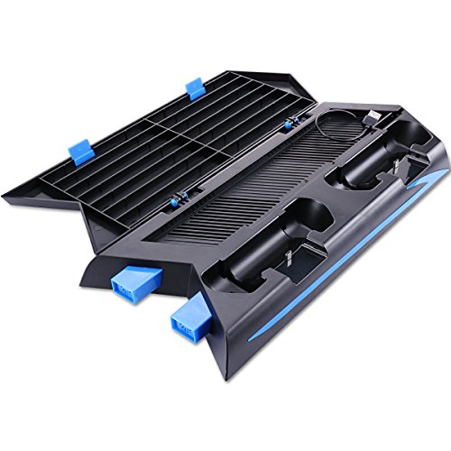 All-In-One, Including PS4 Console Vertical Stand + 2 Cooling Fans + Controller Charging Docks + 14 Slot Game Disc Storage + 3 Additional HUB Ports.
