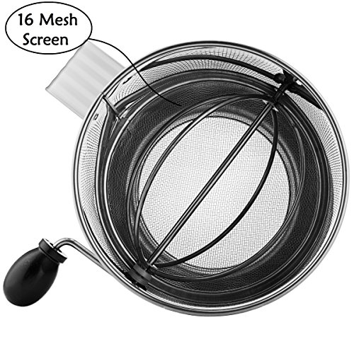 - DURABLE CONSTRUCTION: This flour sifter is made of stainless steel, corrosion resistant, with a highly polished body, handle and 16-mesh screen. The beater is chrome-plated with wire reinforcement on the bottom.