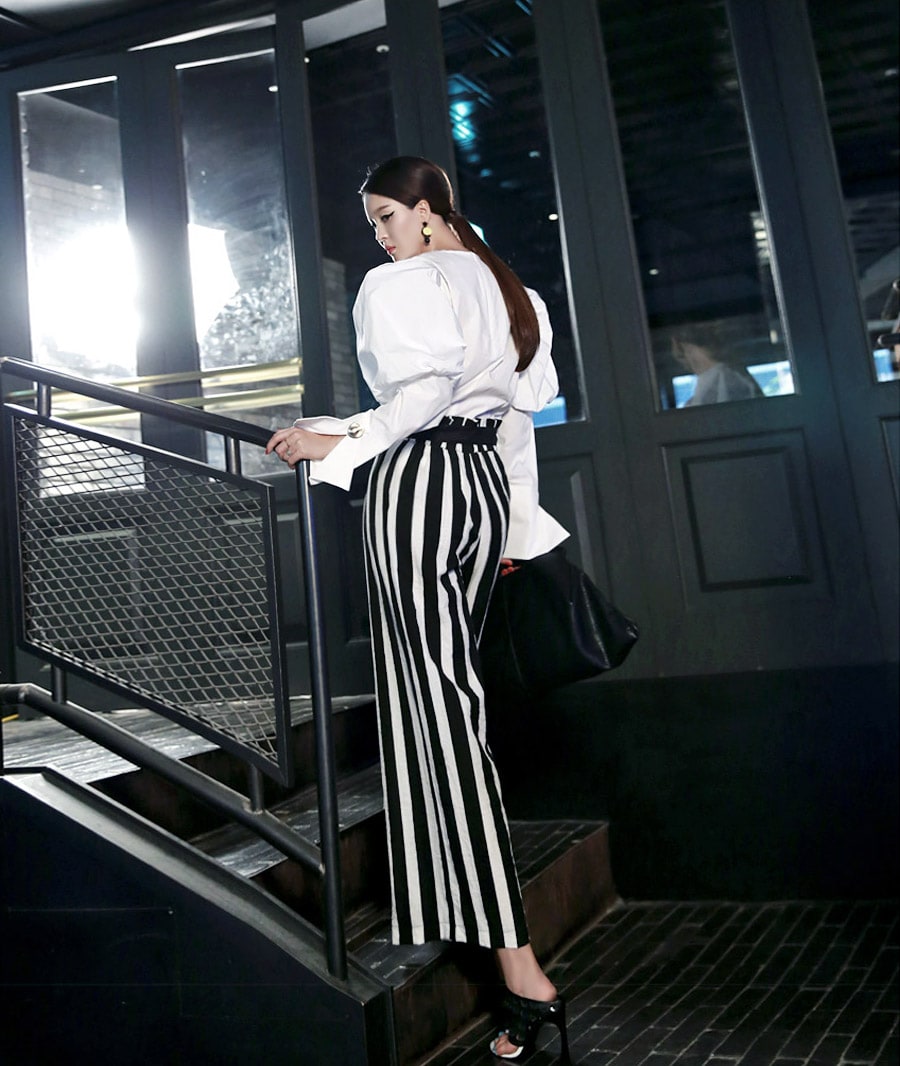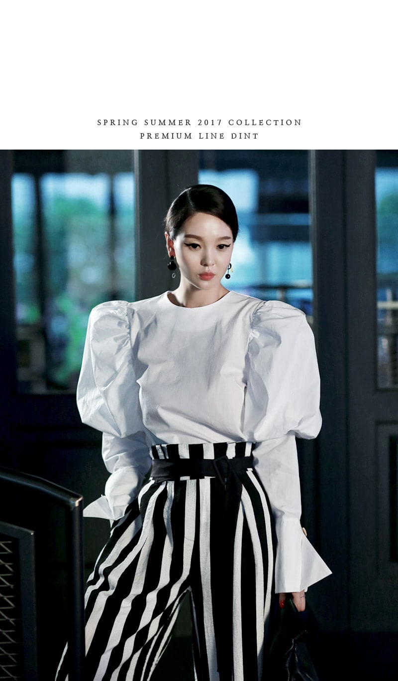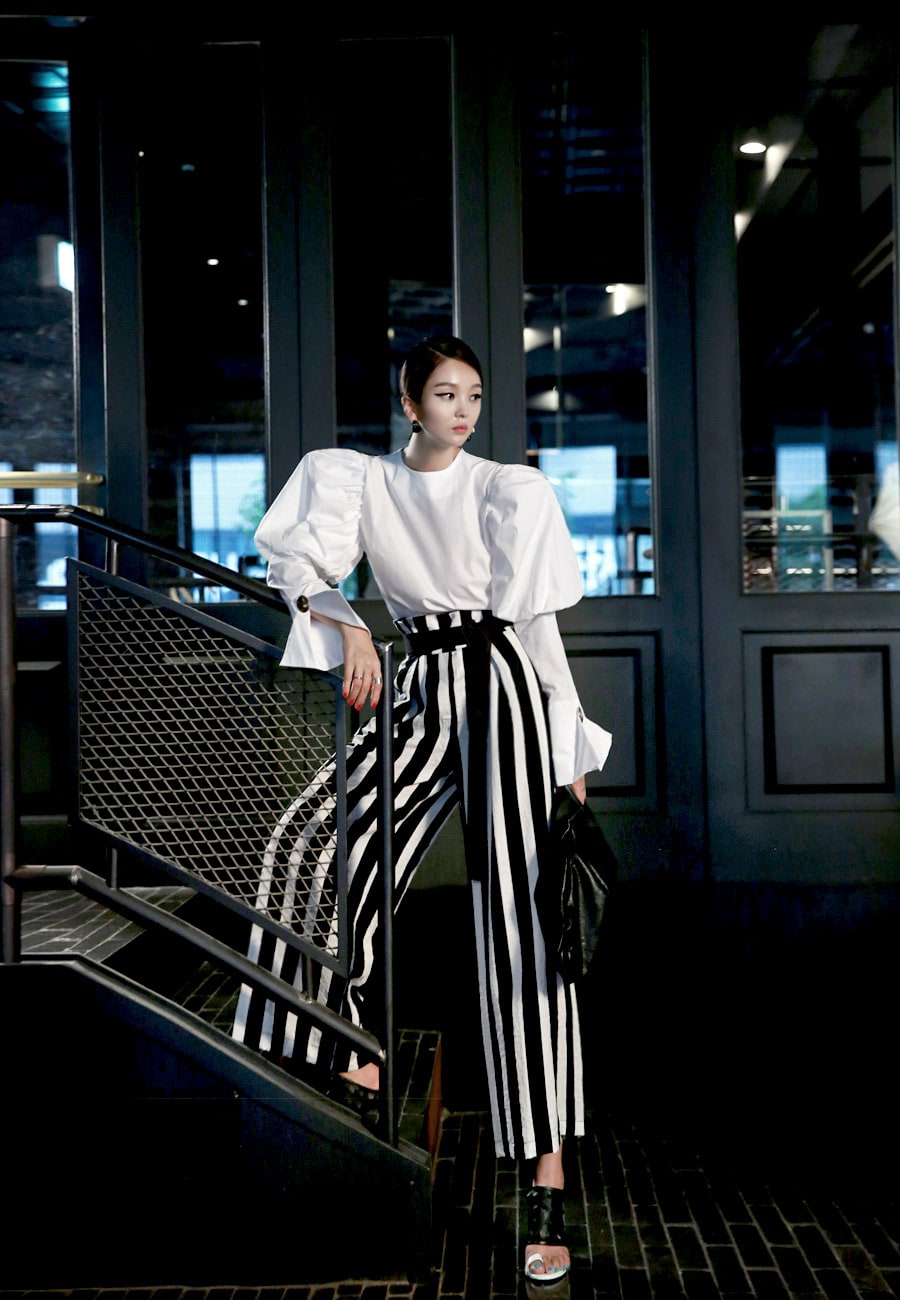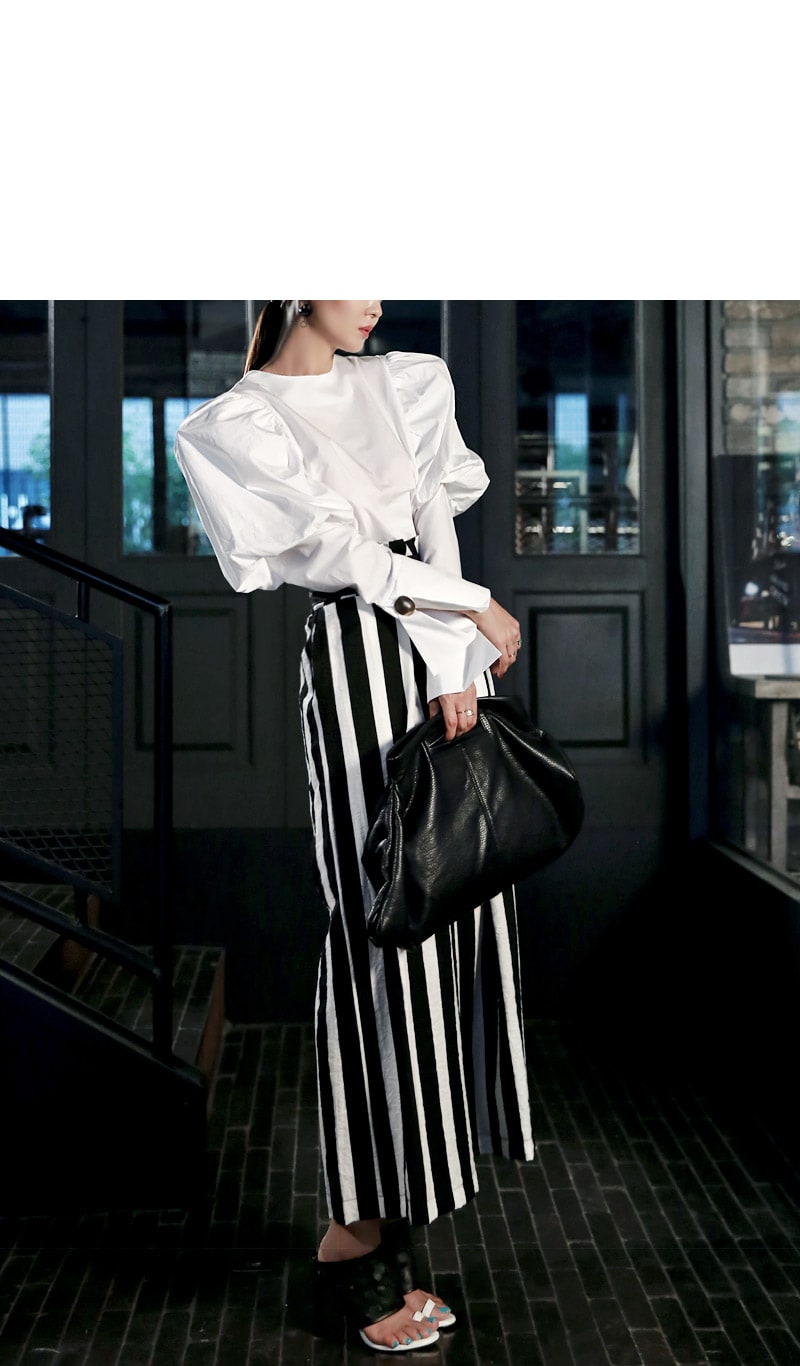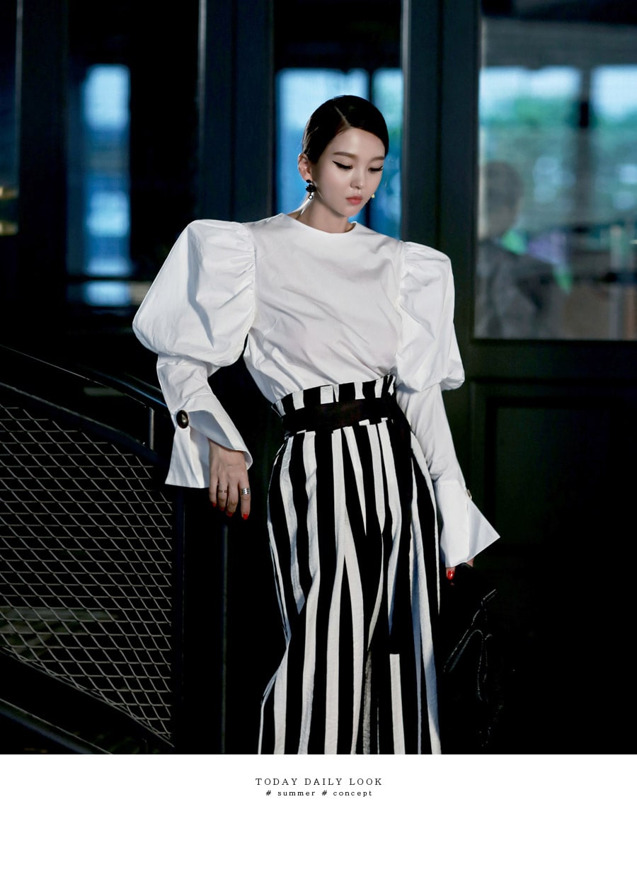 B2054 볼륨퍼프 골딩포인트 블라우스 IvoryP1737 볼드 스트라이프 와이드 슬랙스 Ivory stAJ-3695 이어링 Black+YellowAJ-3179 링 GoldDTHAR-016 프린지 홀 배색 뮬 힐 White+Black