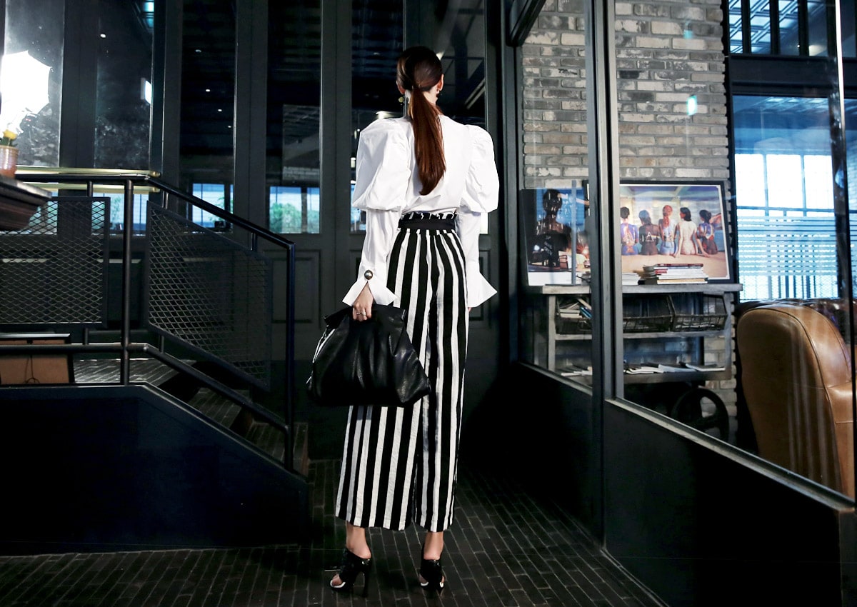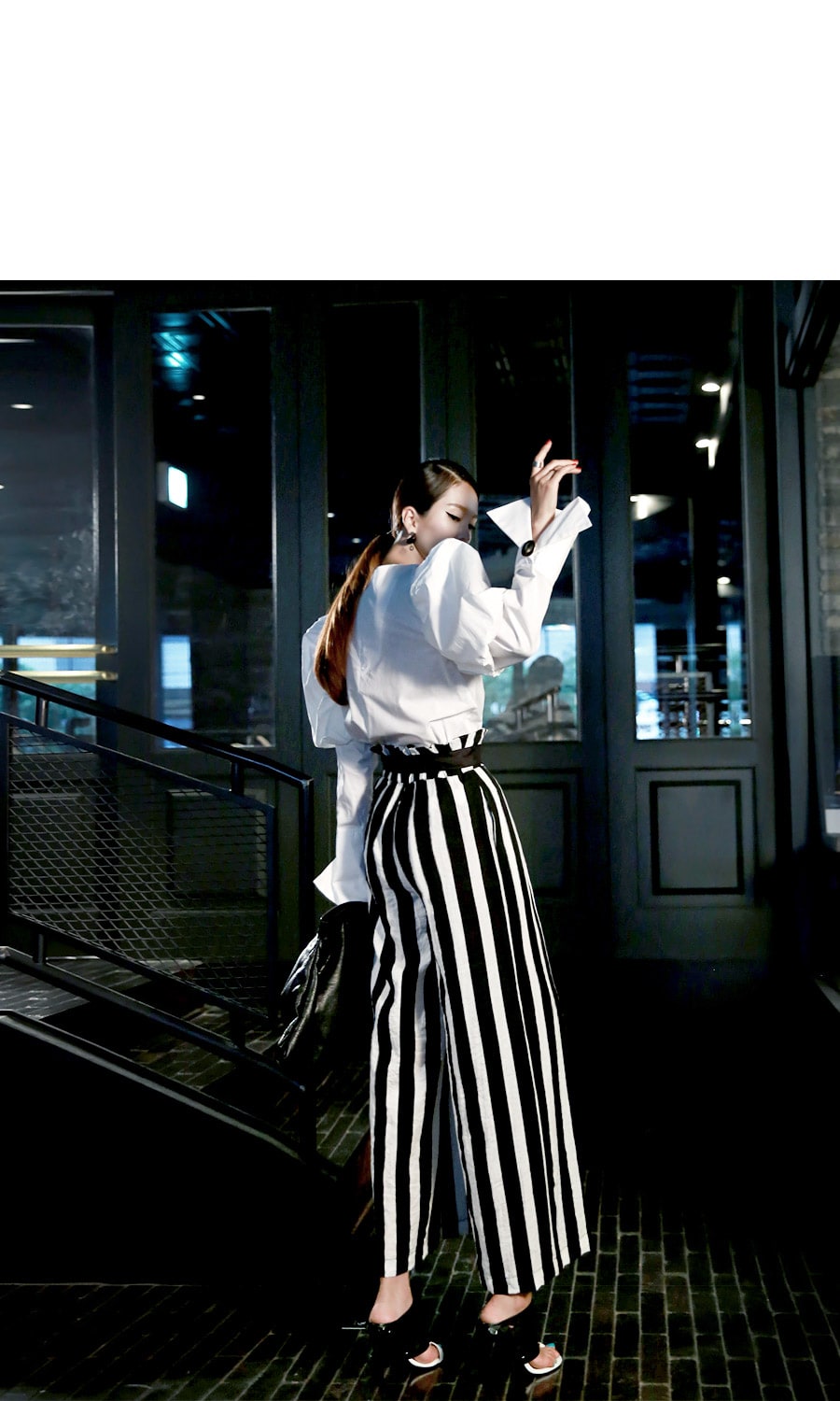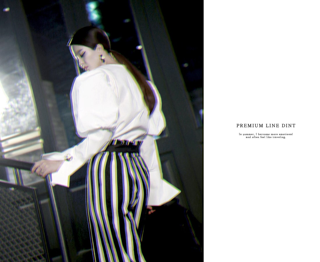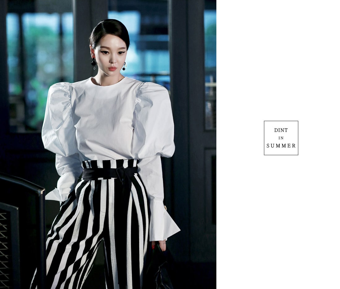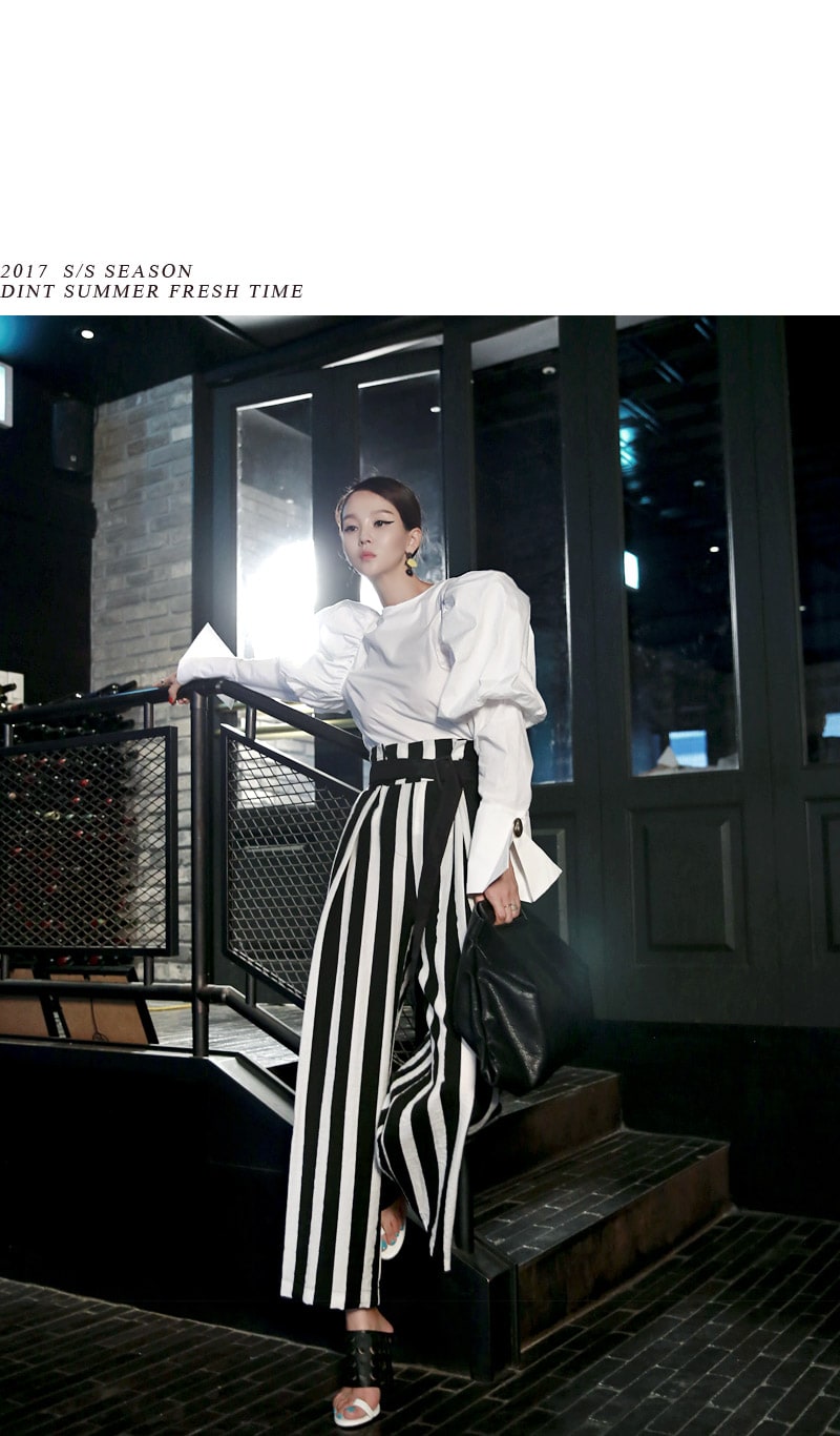 B2054 볼륨퍼프 골딩포인트 블라우스 IvoryP1737 볼드 스트라이프 와이드 슬랙스 Ivory stAJ-3695 이어링 Black+YellowAJ-3179 링 GoldDTHAR-016 프린지 홀 배색 뮬 힐 White+Black