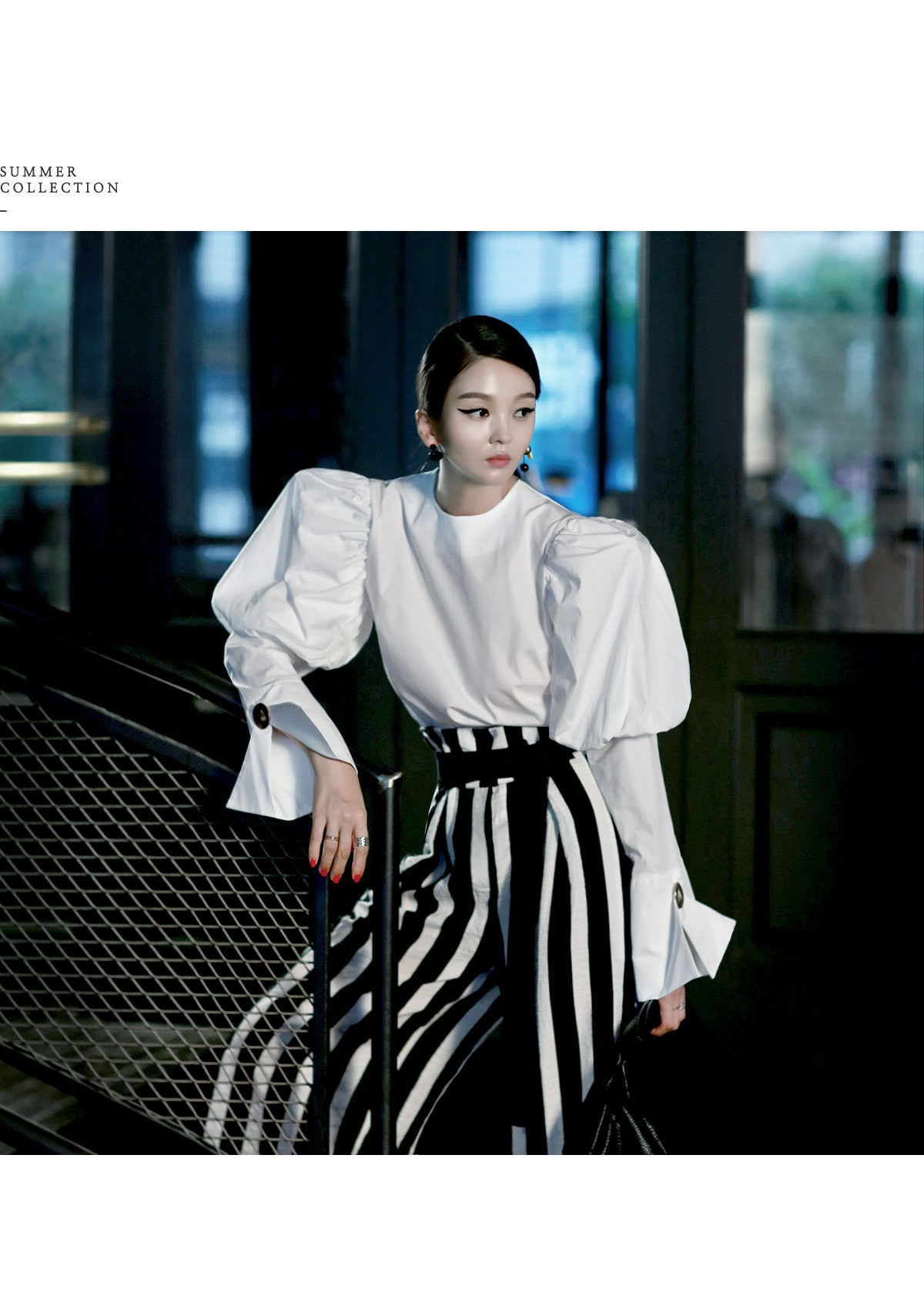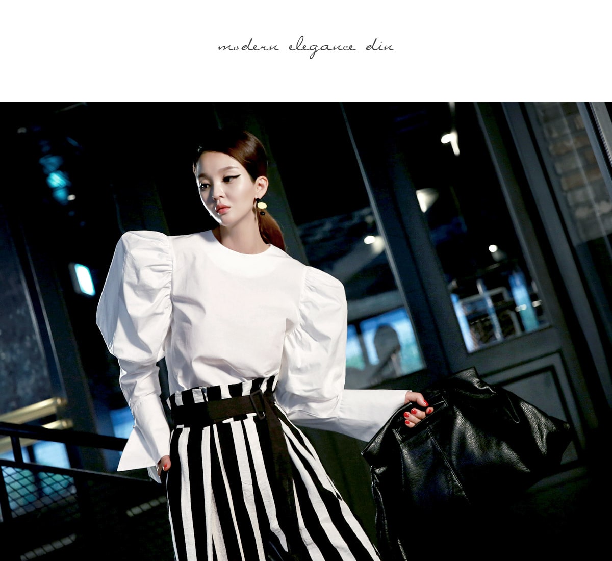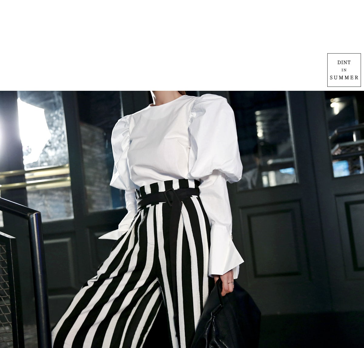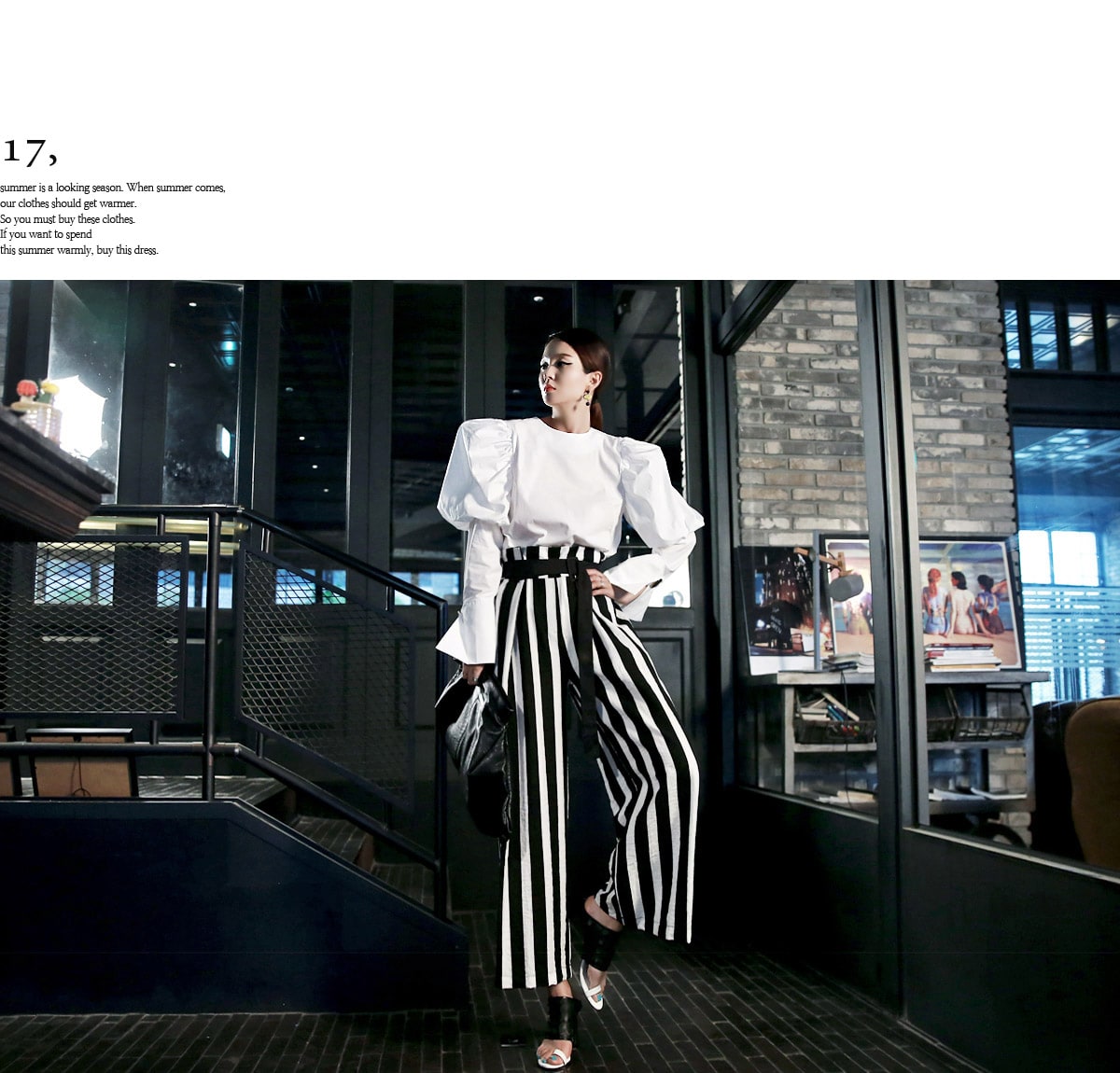 B2054 볼륨퍼프 골딩포인트 블라우스 IvoryP1737 볼드 스트라이프 와이드 슬랙스 Ivory stAJ-3695 이어링 Black+YellowAJ-3179 링 GoldDTHAR-016 프린지 홀 배색 뮬 힐 White+Black