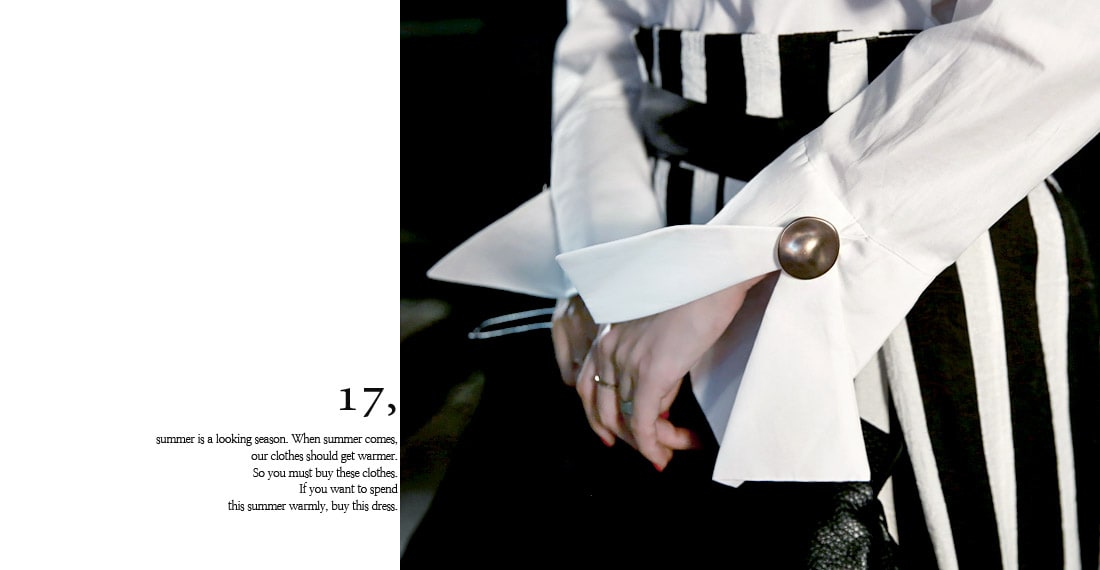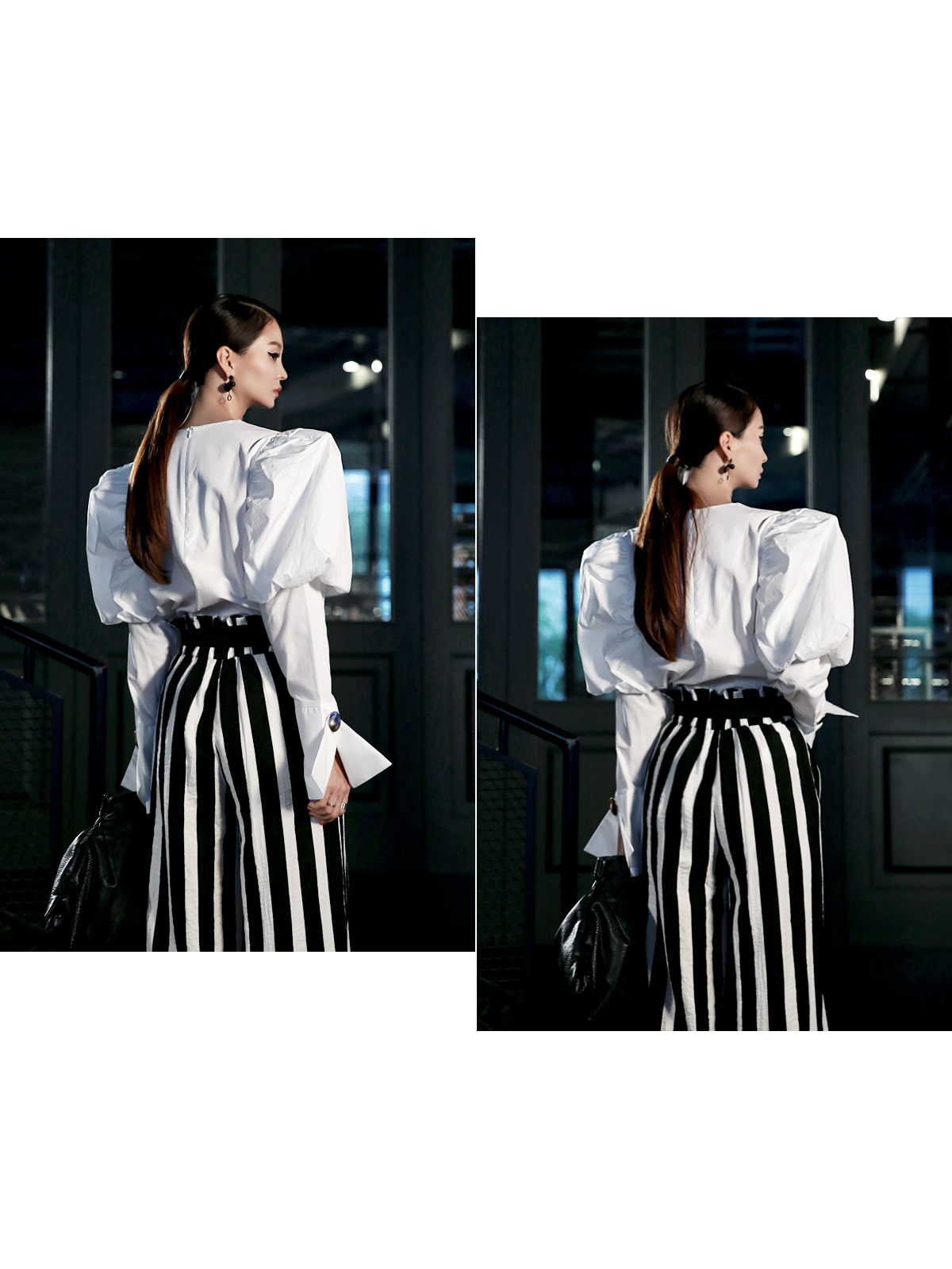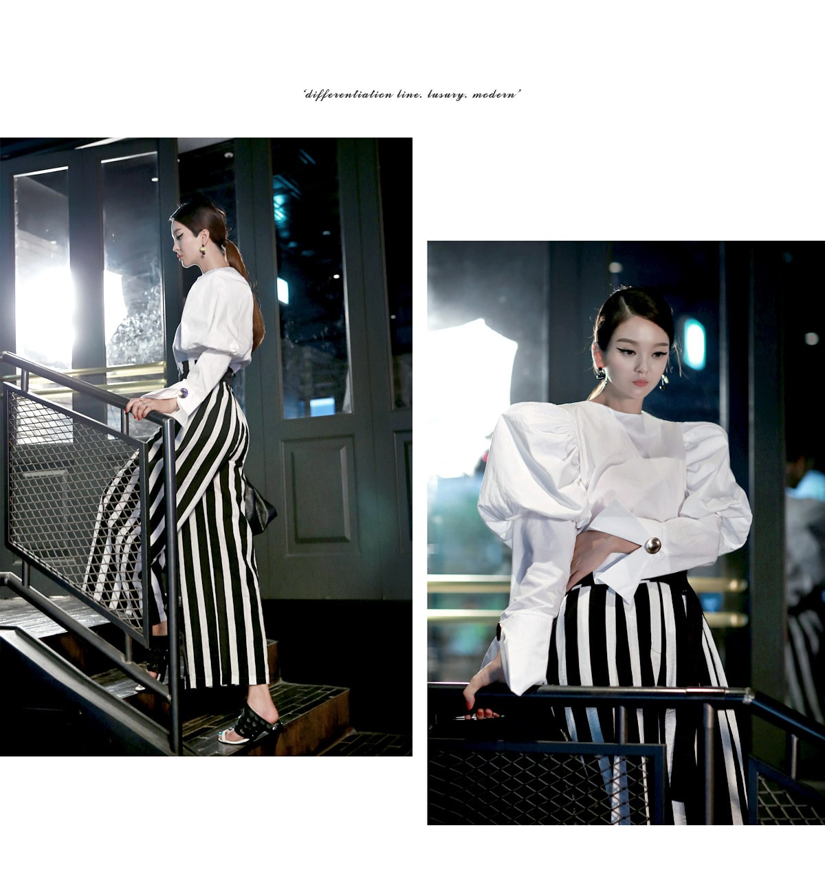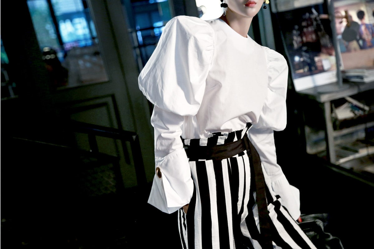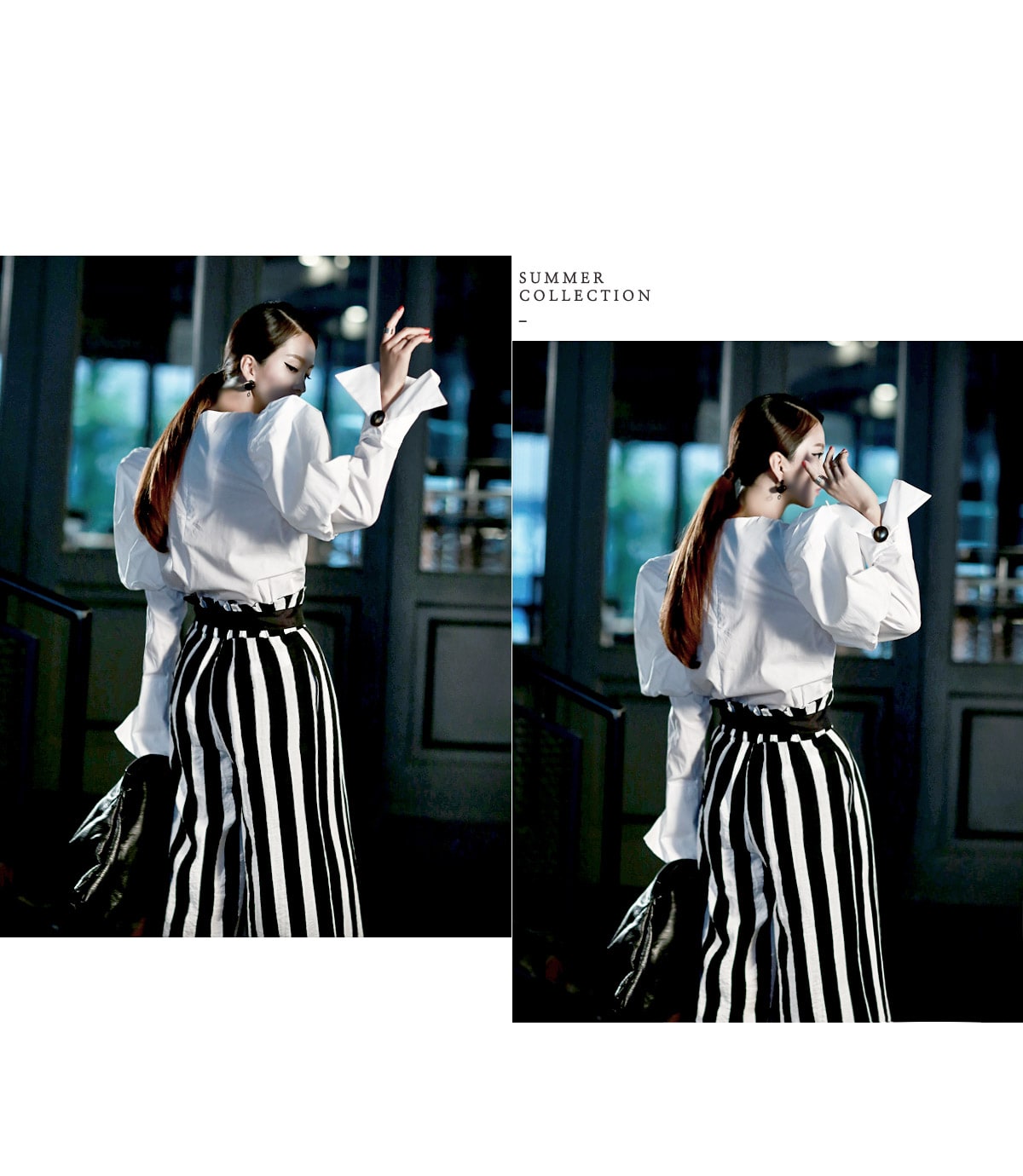 B2054 볼륨퍼프 골딩포인트 블라우스 IvoryP1737 볼드 스트라이프 와이드 슬랙스 Ivory stAJ-3695 이어링 Black+YellowAJ-3179 링 GoldDTHAR-016 프린지 홀 배색 뮬 힐 White+Black