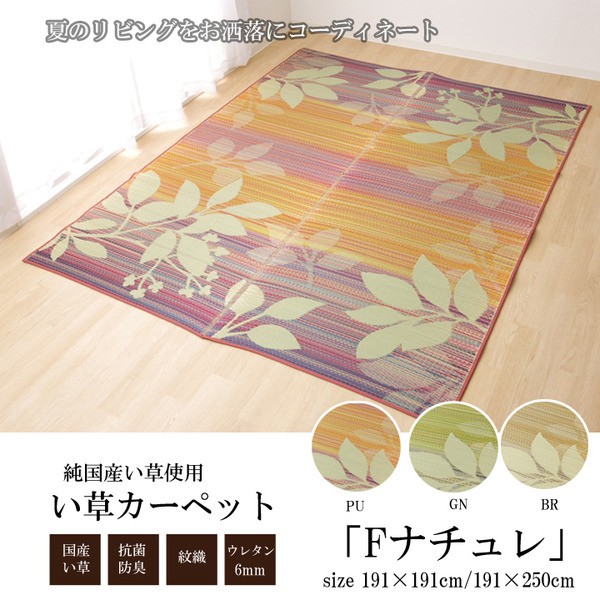 【商品名】い草ラグ 国産 ラグマット カーペット 約3畳 長方形 リーフ柄 『Fナチュレ』 パープル 約191×250cm (裏:ウレタン)