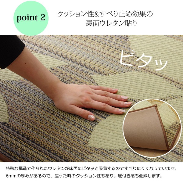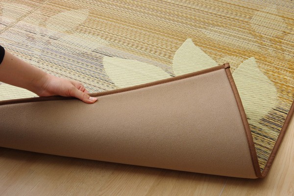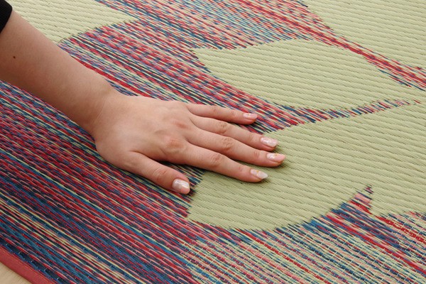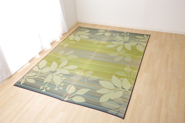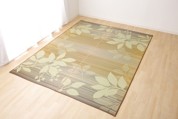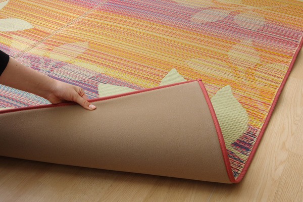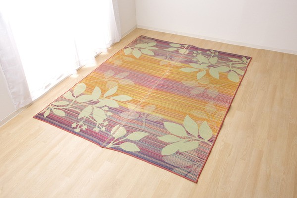 カジュアルなリーフ柄をあしらったカラフルなデザインのい草ラグカーペットです。フローリングでもご使用できるよう、裏地にはウレタンフォームを使用しているためクッション性のある商品です。洋室にも合いやすいように柄はカラフルで明るく、シンプルなものにしました。国産(九州産)のい草を使用しています。一本一本が太く、表皮が厚く繊維がキメ細かいので弾力性があり、耐久性に優れています。い草には空気の自然浄化作用、湿度の調節作用などがあります。また汚れにくく、使用するうちに黄金色に変化し味が出ます。い草に青森ヒバ加工を施しています。(抗菌、防臭効果)