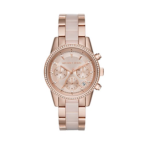 -. Binding : Watch -. Brand : -. Color : Rose Gold -. Department : womens -. EAN : 0796483218482 -. Feature : Rose gold-tone bracelet watch with crystal-encrusted bezel featuring tonal dial with three subdials and date window between the four and five o'clock positions / 37 mm stainless steel case with mineral dial window / Japanese quartz movement with analog display / Features crystal indices and three-link stainless steel-and-ceramic band with deployant-clasp closure / Water resistant to 50 m (165 ft): In general, suitable for short periods of recreational swimming, but not diving or snorkeling -. Label : Watches -. Manufacturer : Watches -. Model : MK6307 -. MPN : MK6307 -. PackageQuantity : 1 -. PartNumber : MK6307 -. ProductGroup : Watch -. ProductTypeName : WATCH -. Publisher : Watches -. ReleaseDate : 2012-04-23 -. Size : 37 mm -. Studio : Watches -. Title : Women's Ritz Rose Gold-Tone Watch MK6307 -. UPC : 796483218482