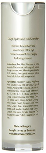 Eminence Organics Raspberry Eye Masque(1.05 oz./30 ml)Benefits For all skin types Increase the elasticity and smoothness of the eye contour area with this deeply hydrating masque Improve firmness, and nutrition to the delicate contours of your eyes Fights against free radical damage and improves dark circles, inflammation and broken capillaries Reduces puffiness and brightens skin Features Raspberry fights free radical damageVitamin K reduces puffiness, dark circles and heals skin Wild Hops is a natural skin nourishing antioxidantShea Butter deeply moisturizes and soothes skin Witch Hazel is an anti-inflammatoryMedlar firms skin and promotes elasticityGinseng improves skin connective tissueEminence Organics is a highly effective, entirely organic skin care line. With all naturally organic ingredients these hand-made products are effective and extremely healing. Rich in vitamins, active ingredients and nutrients, Eminence products will give you immediate results that you will see and feel.Feature