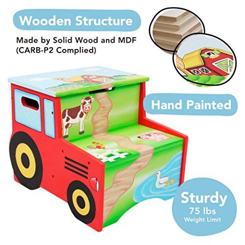 Step up and pitch in on the farm. Fantasy Fields' Happy Farm Storage Step Stool, gives your little ones a leg up in pitching in. Whether it is to reach new heights so they can brush their teeth, or get a boost into or out of bed this stool is a must have. Decorative tractor lines the sides of the step stool and scenic mural of the farm is displayed on the step stool.Feature