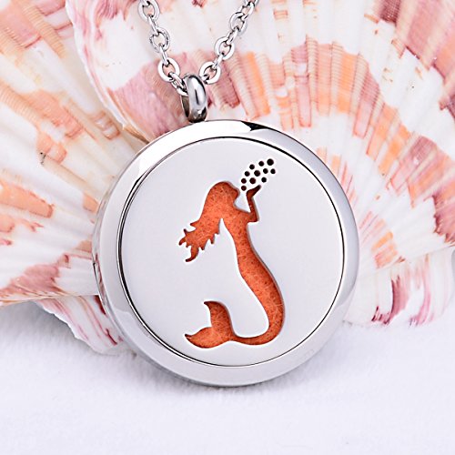 Mermaid Aromatherapy Essential Oil Diffuser Necklace Stainless Steel Round Locket Pendant 24" Chain,12 Refill Pads