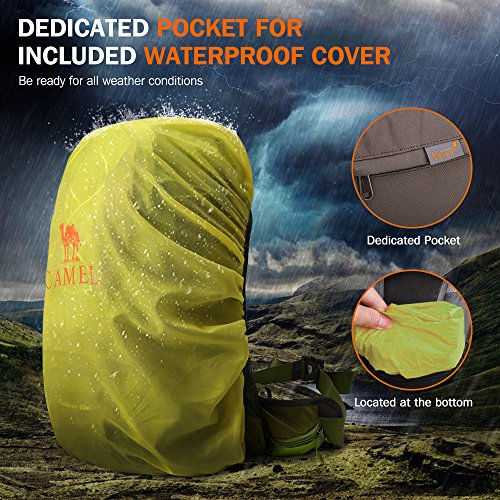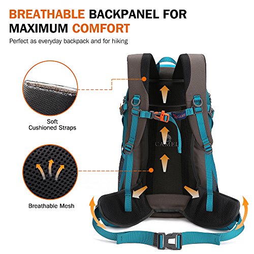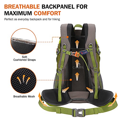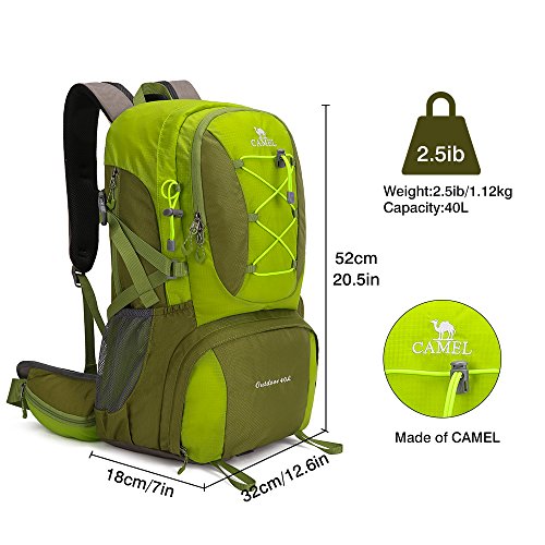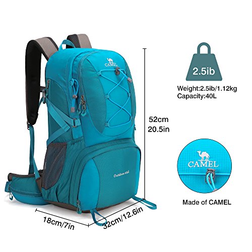-. Brand : Camel -. Feature : 1.Durable: This CAMEL Backpack is made with high quality tear material, provides extra strength and long-lasting performance with the lightest weight possible. / 2.Lightweight (1.12kg) and Roomy(40Liters): Dimensions: 32 x 18 x 52cm. / 3.Stylish Design and Color Matching: When you carry this CAMEL backpack, you can not only do good outdoor activities, and make you look more stylish and attractive. / 4.Comfortable Daypack: Breathable mesh shoulder straps with plentiful sponge padding help relieve the stress from your shoulder. Widened and thickened S-type shoulder straps and high elastic breathable back support for best ventilation and easing burden. / 5.-WARRANTY- Free return within one year, if you have any questions, please do not hesitate to contact us. -. Label : CAMEL -. Manufacturer : CAMEL -. ProductGroup : Sports -. ProductTypeName : OUTDOOR_RECREATION_PRODUCT -. Publisher : CAMEL -. Studio : CAMEL -. Title : Camel 40L Travel Backpack Lightweight Hiking Backpack Daypack Waterproof with Rain Cover for Camping Climbing Outdoor Mountaineering Fishing by