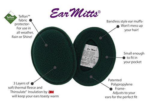 Binding : Apparel Product Description Ear Mitts® are designed to fit securely on your ears, keeping them protected from the wind and cold. Three layers of soft and durable lightweight DuPontTM Teflon® fabric protector infused anti-pill fleece and 100 gram ThinsulateTM Insulation from 3M keeps warmth in and the wind and cold air out. A patented flexible polypropylene frame adjusts to your ears and becomes more comfortable the more you wear them. A stylish alternative to traditional scarves and band ear muffs, Ear Mitts® provide warmth and comfort without interfering with your hairstyle! They also fit comfortably under helmets, caps, stocking hats - any headgear! The design permits unrestricted hearing during use. Compact enough to fit in a pocket, fanny pack, or hand bag. Fleece Ear Mitts® are infused with DuPontTM Teflon® fabric protector which repels water, snow, and oil-based stains such as make-up. For care, hand-wash and dry flat. Available in fleece, denim, faux fur, faux leather, faux suede, velvet, sparkle, and embellished with Swarovski Crystals from Austria - See our other products on Amazon! 0