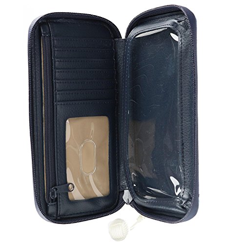 - Interior has a 6 x 3 inch phone pocket, 6 card slots, 1 ID, 1 slip pocket, & a zipper pocket