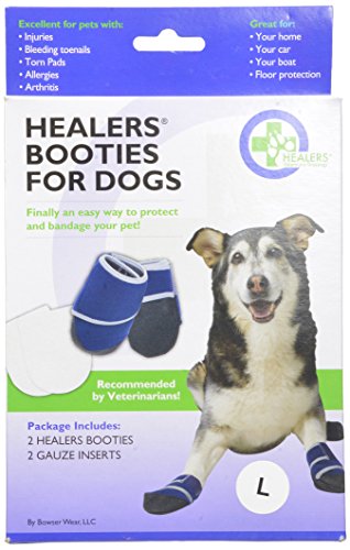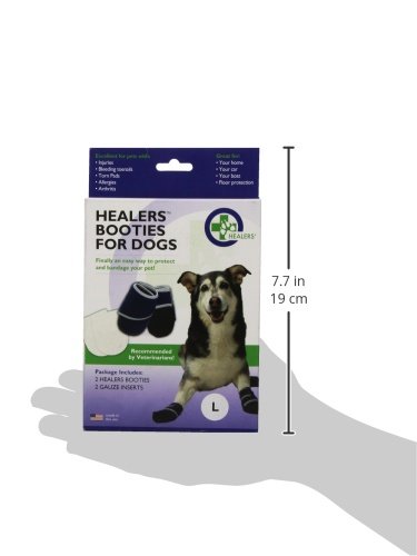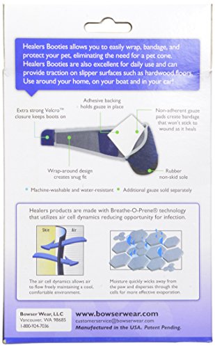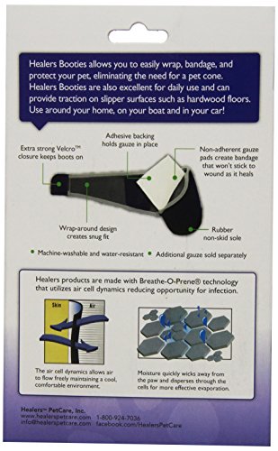 Studio : Healers PetCare, Inc Publisher : Healers PetCare, Inc Binding : Misc. Product Description Healers Booties are designed for protection and healing. The Healers boot provides air flow and moisture wicking properties, decreasing the opportunity for infections and shortening recovery time for injuries to the animal. Healers are manufactured with a High Tech medical grade material that is used in the human market for healing wraps. Its outer surface is loop fabric so the hook can attach anywhere. This provides pet owners the ability to get a snug, secure, fit as they wrap the boot around the paw. The Velcro Hook applied is low profile, high tensile strength hook that enables a strong hold, keeping the boot in its place. Healer's uses the highest quality components available and are made in the USA. They are recommended and used by Veterinarians. Our boots are made to last and are machine washable. Healers Gauze Inserts are designed to fit right inside the boot turning the boot into a non-adhesive bandage. The gauze pads will not stick to the wound while it heals and it has adhesive on the back side so you can place it where you need it. Healers Boots are comfortable, they provide traction on hardwood floors and the synthetic leather sole are perfect for light outdoor use. Best of all they are a bandage that is easy to use and make dressing changes a snap. Healers booties are sold as individual units or in a box set with 2 boots and 2 gauze inserts. They come in 5 sizes from extra small to extra large. Healers Gauze pads can be purchased separately. If you need added protection, check out Healers Leg Wraps. The leg wraps will connect to the boots extending the boot up the leg. 0