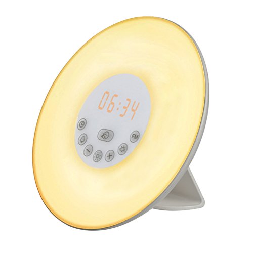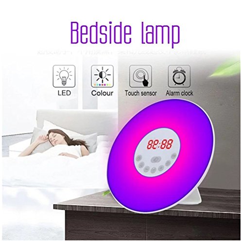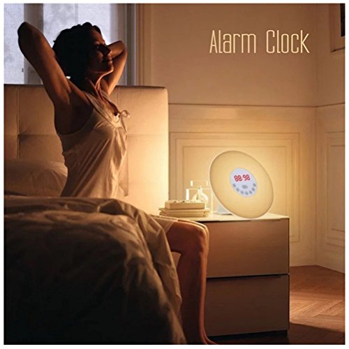 6 CHANGING COLORS & TOUCHING CONTROL COLOR - The wake up light color will automatically change from warm white light to green, red, blue, purple, orange,indigo and keep circulating.10 levels light intensity can be selected.Or it can work as a bedside lamp or mood light.
