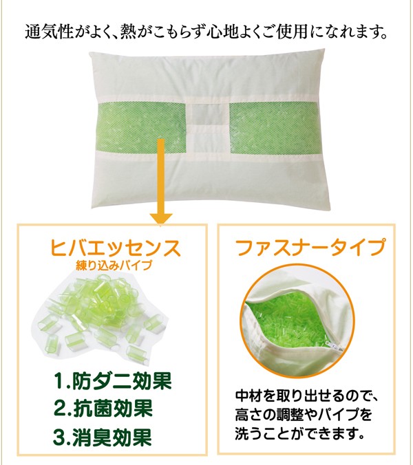 ヒバエッセンス練り込みパイプを使用しています。青森県のヒバの木から抽出した「ヒバエッセンス」をメーカー独自の技術でパイプに加工しました。ヒバエッセンスにはヒノキチオールという、天然物質では極めて抗菌性の高い成分が含まれています。(無加工品に比べ、抗菌・防臭効果があります。)ヒバエッセンスで安らかな森の眠りをご提案します。パイプ使用のため、通気性がよく、熱がこもらず心地よくご使用できます。ファスナー式で中材(パイプ)の交換、高さ(量)の調節が可能です。ご家庭で簡単にパイプが洗えます。