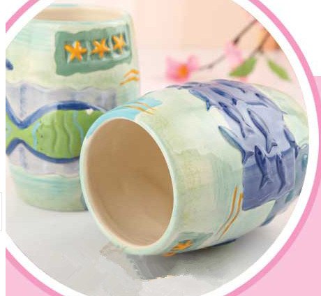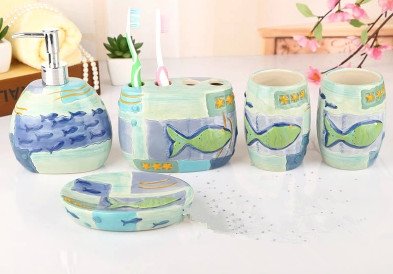 -. Feature : Its main material is a ceramic. / Good design and nice look, make your bathroom and your life colorful. / By two cups, one toothbrush cup, one lotion bottle, one soap dish, five-piece component. / This is a good gift. / Hand washing liquid bottle size:17*13cm, tooth mug size:11*9cm, toothbrush holder size:14*10cm, soap dish size:14.5*2.6 cm