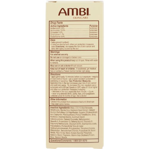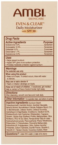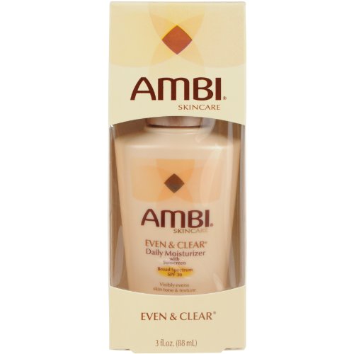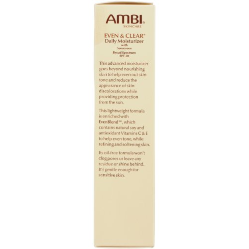 -. Binding : Health and Beauty -. Brand : AMBI -. EAN : 0885839594025 -. Feature : Case of two 3-ounce bottles of skin moisturizer with SPF 30 (total of six ounces) / Enriched with EvenBlend, a combination of natural soy and Vitamins C and E / Contains advanced sun protection to protect against damaging UVA and UVB rays / Recommended by the Skin Cancer Foundation / Non-comedogenic, oil-free formula -. Label : Ambi -. Manufacturer : Ambi -. MPN : AMB-3589 -. NumberOfItems : 2 -. PackageQuantity : 2 -. PartNumber : AMB-3589 -. ProductGroup : Beauty -. ProductTypeName : BEAUTY -. Publisher : Ambi -. Size : 3 Ounce ( Pack of 2) -. Studio : Ambi -. Title : Ambi Skincare Even & Clear Daily Moisturizer with SPF 30, 3 Ounce (Pack of 2) -. UPC : 381370022275