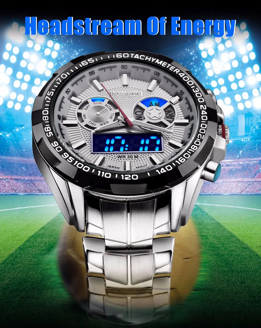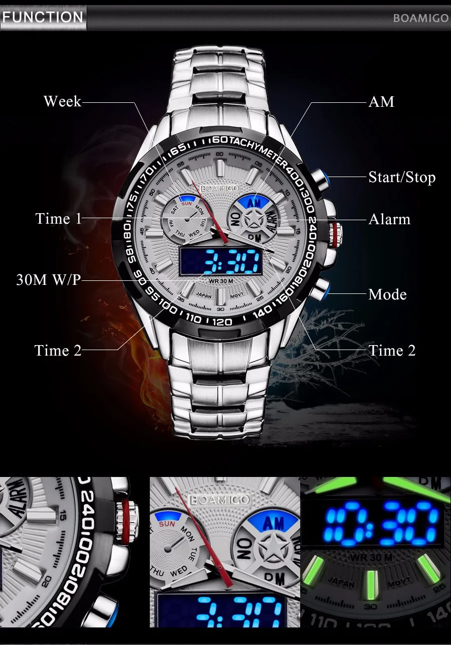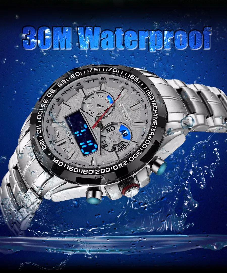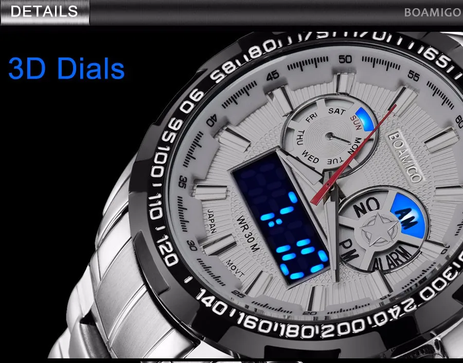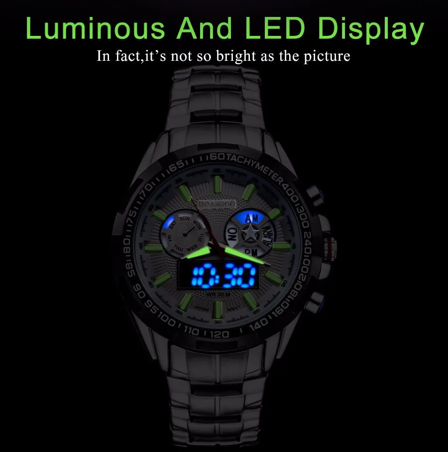 Feature:Water Resistant,LED display,Multiple Time Zone,Luminous,Auto Date,Complete Calendar,Back Light,Alarm
