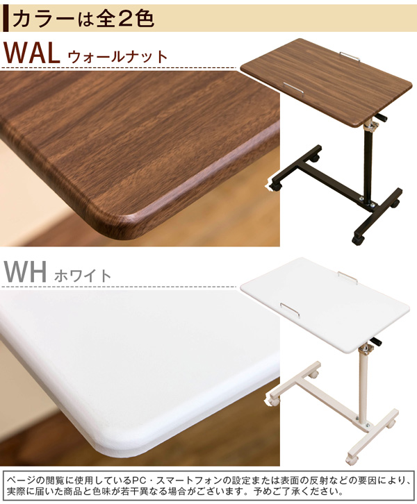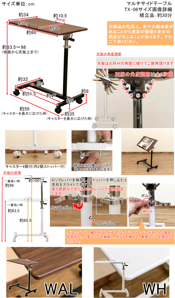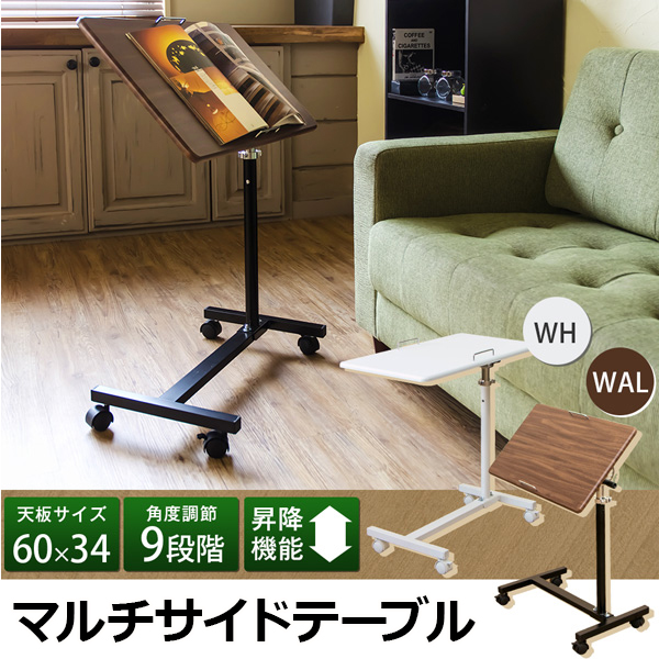 本商品はお取り寄せ商品のため、稀にご注文入れ違い等により欠品・遅延となる場合がございます。誠に恐れ入りますが、何卒ご了承ください。 また、以下の場合には追加送料がかかる場合がございます。  ・大型商品の複数購入時 ・同梱区分が異なる商品の複数購入時  【出荷目安】:1 - 4営業日 ※土日・祝除く 【同梱区分】:TS 1490 【梱包サイズ】:大型商品 【代引き決済】:不可  配送伝票の依頼主は出荷元(メーカーもしくは仕入元)名となる場合がございますので、お受け取りの際はご注意ください。   【型番】TX06  【商品名の色やサイズについて】 こちらは「マルチサイドテーブル(キャスター付きミニテーブル) ウォールナット 幅60cm スチールフレーム 天板昇降式 角度調節可」の商品ページです。商品画像や商品情報には、色違いやサイズ違いの商品が載っている場合がございます。ご注文前に色・サイズ・セット内容のご確認をお願いいたします。  マルチサイドテーブルです  ベッドサイドやソファサイドで役立ちそうです  天板は昇降します(地面から約63.5~98cm) 一番高くすると立ち作業にちょうどいい高さです 角度調節も可能です(全9段階) 天板を傾けた際、本や雑誌を置いても落ちないよう上下にブックスタンドが付きます(取り外すことも出来ます)  ウォールナット(WAL)、ホワイト(WH)の2色展開です  幅600×奥行350(キャスター含む)×高さ655~1000mm(梱包重量:幅645×奥行410×高さ80mm) 天板厚:約15mm 天板サイズ:600×340mm 本体重量:4.9kg(梱包重量:5.5kg) 組立式(約30分/付属の工具にて組立)1個口 天板:合成樹脂化粧繊維板 フレーム:スチール(エポキシ粉体塗装) キャスター4個(うち2個ストッパー付き)  原産国:台湾  【ご注意事項】 ※本商品は、北海道・沖縄・離島への配送はいたしかねます。あらかじめご了承ください。