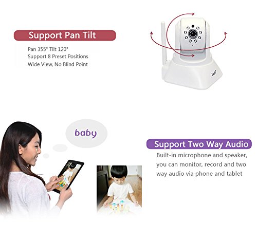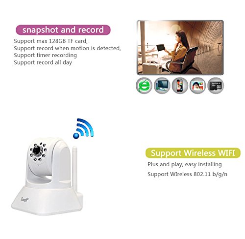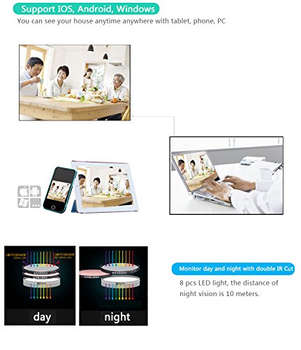-. Feature : 1/2.7" CMOS 2 Megapixel, 1080P, H.264 format, 3X Digital Zoom, 3 Video Stream Output, Three Levels Account and Password (admin / guest / user), Multi-user Managerment / Smart WiFi, Indoor, Plug and play, Support Onvif 2.1, Works Anywhere Within Your WiFi Coverage / Support iPhone / iPad / Android / PC, Local TF Card Slot support 2G/4G/8G/16G/32G/64G/128G card / Built-in 2 Motors, Pan & Tilt, Horizontal 355° Vertical 120°, IE Support Auto Cruise and 8 Preset Positions / Night Vision 10m, IR-Cut, No Color Cast, 8pcs LED Lights, Motion Detection, Push Notification for iPhone / Android App
