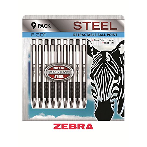 Zebra F-301 Ballpoint Retractable Pen, Black Ink, Fine Point Tip, 9 Pens per Pack Refillable Pens with Refill 0.7 mm Stainless Steel
