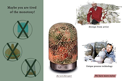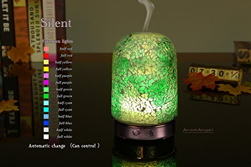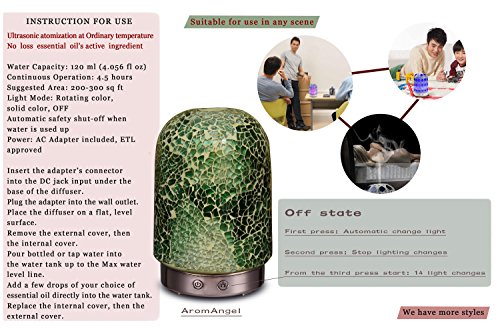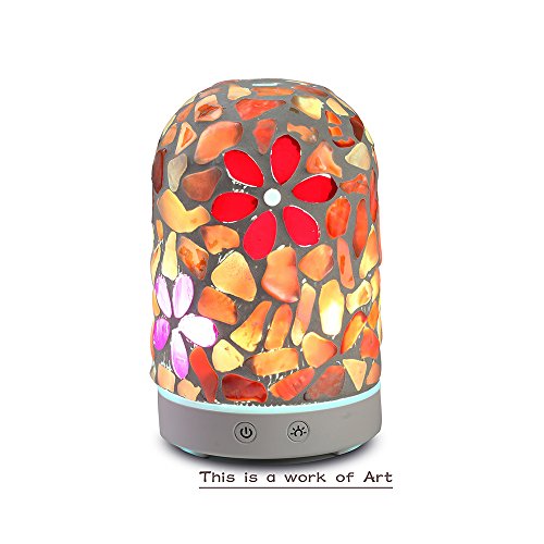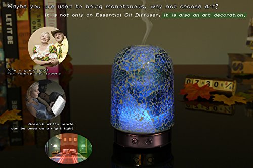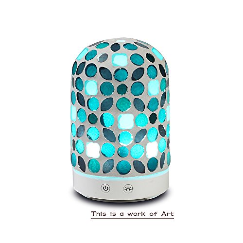 Description The diffusers begin with the Artistâ€TMs design, and are manufactured using proprietary mosaic glass technology. The Diffusing Mister creates ultrasonic vibrations to transform your essential oils and water into a health creating, fragrant addition to your room. Function Switches On / Off Switch - Press to activate mister. Press again to shut the mister off. Light Switch: 01st press - Rotating lights; 02nd press - Fix color; 03rd press - Half Red;???04th press - Full Red; 05th press - Half Yellow;??06th press - Full Yellow; 07th press - Half Purple;??08th press - Full Purple; 09th press - Half Green; ??10th press - Full Green; 11th press - Half Cyan; ?? 12th press - Full Cyan; 13th press - Half Blue;???14th press - Full Blue; 15th press - Half White; ??16th press - Full White; 17th press - Light off. About this item You may prefer this new style of Aromatherapy machine to the conventional products which lack the aesthetic appeal of our 120 ml Ultrasonic Diffuser units Applying our adapted Ultrasonic technology, this diffuser is extremely quiet when in use, and has an automatic shutoff when the water is low The item is portable for anywhere there is a compatible outlet; Gym, Yoga, Spa, Nursery, Office, Bedrooms or Living Areas. It is the perfect gift for friends and family who love Aromatherapy or have issues which Essential Oil Aromatherapy can help to heal The mosaic glass Aromatherapy Essential Oil Diffuser is not only an aid to health, but also an object of art you will be proud to display in your home, office, or anyplace you may travelFeature