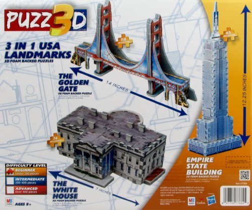 -. Binding : Toy -. Brand : puzz 3d -. EAN : 0047754776645 -. Feature : Includes 3 3d puzzles. / The Golden Gate Bridge. 14" x 7.25" x 2.25". / The White House. 7" x 2.75" x 5.5". / The Empire State Building. 12.5" x 3.5" x 1.75". / 257 pieces all together. -. IsAdultProduct : 0 -. Label : puzz 3d -. Manufacturer : puzz 3d -. MPN : na -. PackageQuantity : 1 -. PartNumber : na -. ProductGroup : Toy -. ProductTypeName : TOYS_AND_GAMES -. Publisher : puzz 3d -. Studio : puzz 3d -. Title : Puzz3D 3 in 1 USA Landmarks- The White House, The Empire State Building, and The Golden Gate Bridge by puzz 3d -. UPC : 792491795007