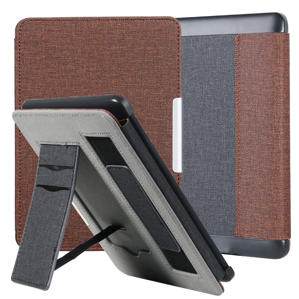 We achieved this with a form fitted cover that does not require straps over the front of the device, enabling the cover to wake your Kindle or put it to sleep by opening and closing it, and a subtle woven nylon interior perfectly colored to disappear along with the device. Additionally, the cover is designed to fold back, so you can read comfortably with just one hand.