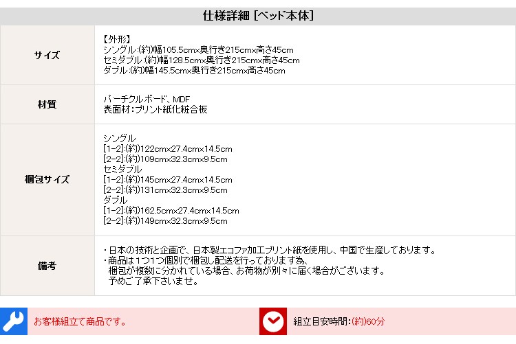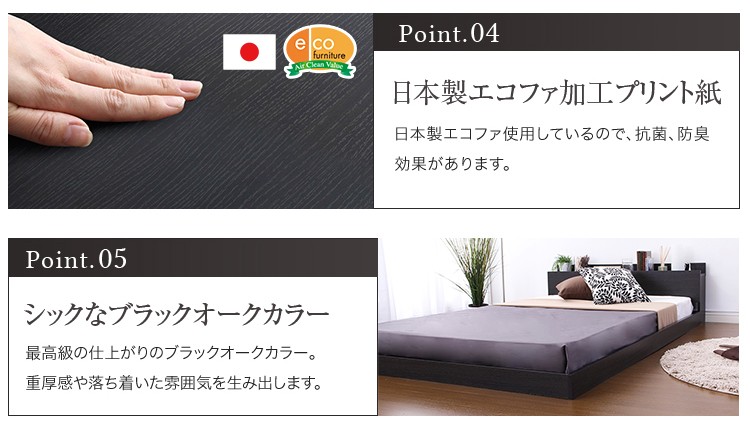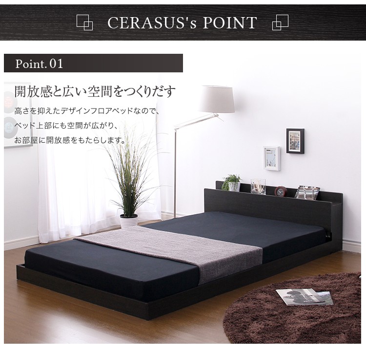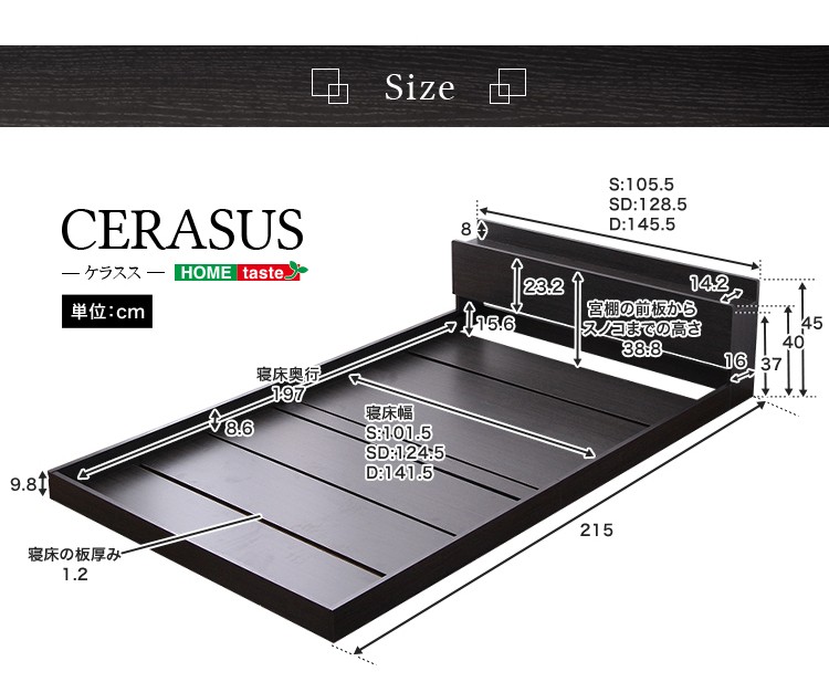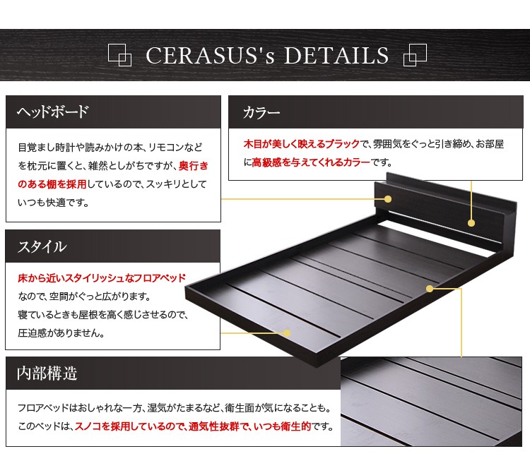 【商品について】デザインフロアベッド【ケラスス-CERASUS-(シングル)】(マルチラススーパースプリングマットレス付き)■サイズ:(本体)(約)幅105.5cmx奥215cmx高45cm (マットレス)(約)幅97x奥行き195x高さ16cm (約)17kg■カラー:ブラックオーク■素材:(本体)パーチクルボード、MDF、表面材:プリント紙化粧合板(マットレス)側地:ポリエステル60%、綿20%、レーヨン20%中材:マルチラススプリング、パームパッド、ウレタンフォーム、フェルト、樹脂綿、不織布■その他:・お客様組立商品です・梱包サイズ:(本体)(1-2)(約)122cmx27.4cmx14.5cm(2-2)(約)109cmx32.3cmx9.5cm(マットレス)(約)98x196x17cm(12才)(約)18kg