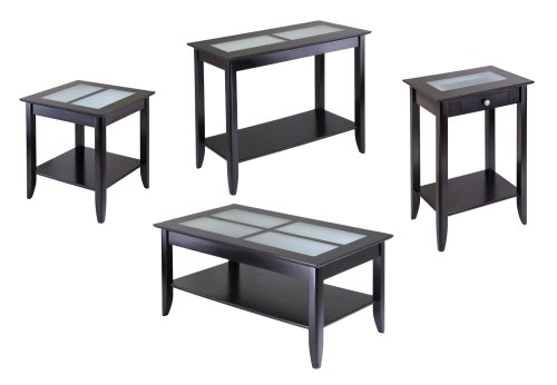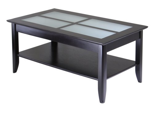 -. Feature : Rectangular coffee table from Winsome Wood for living room or bedside use / Wood construction with dark espresso finish; 4-pane frosted glass top / Lower shelf for storing books, magazines, remote controls, or decorative items / Hardware and tools included for necessary home assembly; matching TV stand, phone stand, and end table available separately / Measures 40 inches wide by 23 inches deep by 18 inches high