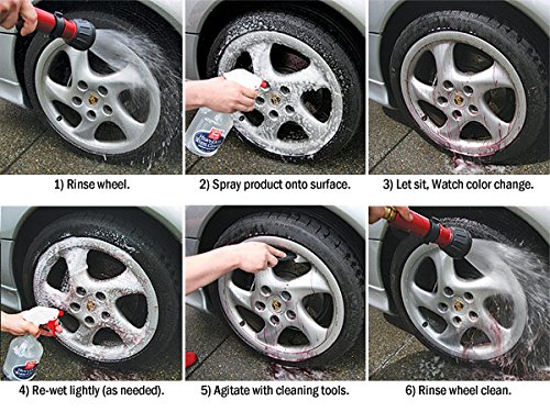 Viscous liquid stays on wheel to break up and loosen brake dust and road grime