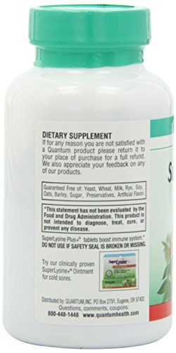 Studio : Quantum Publisher : Quantum Binding : Health and Beauty Product Description The leading lysine formula in natural stores!. Supports immune strength. Excellent when used in combination with Super Lysine cold sore ointment. Contains LLysine plus 5 immune boosting nutrients: Vitamin C, Echinacea, Licorice, Propolis, Oderless Garlic. 0