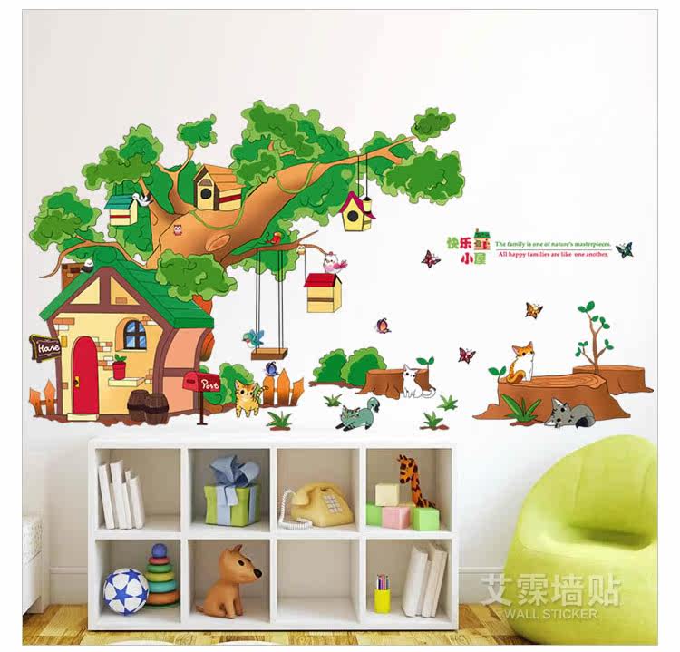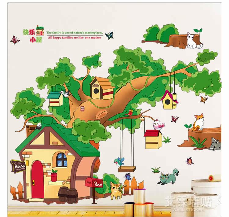 墙贴大树屋猫咪动物幼儿园布置卡通宝宝女儿童房男孩墙纸贴纸自粘