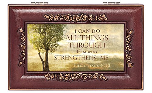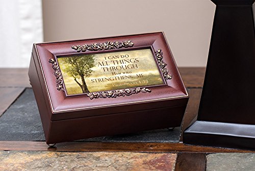 Him Who Strengthens Me Phil. 4:13 Rose Wood Finish Jewelry Music Box Plays Canon in D