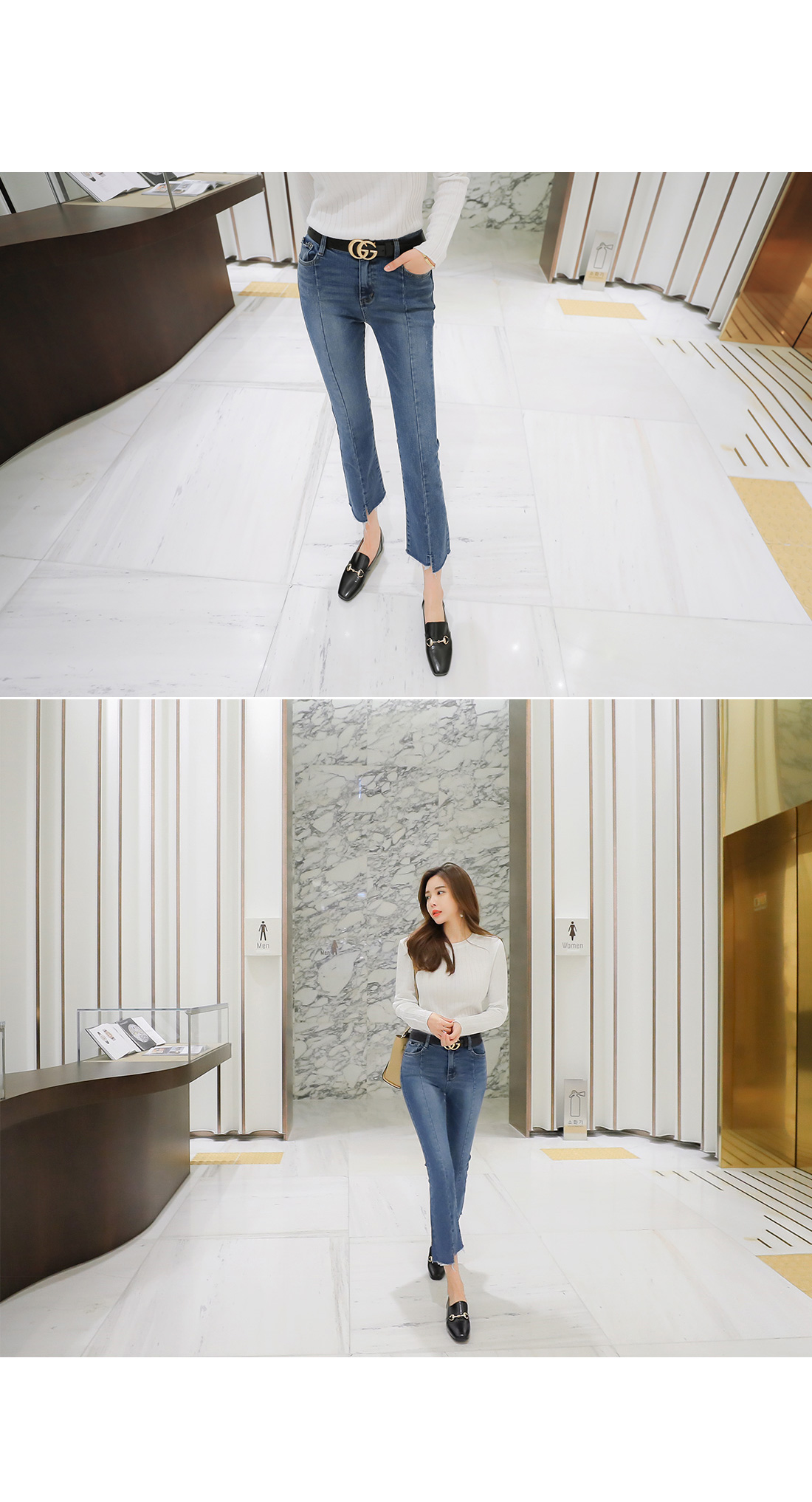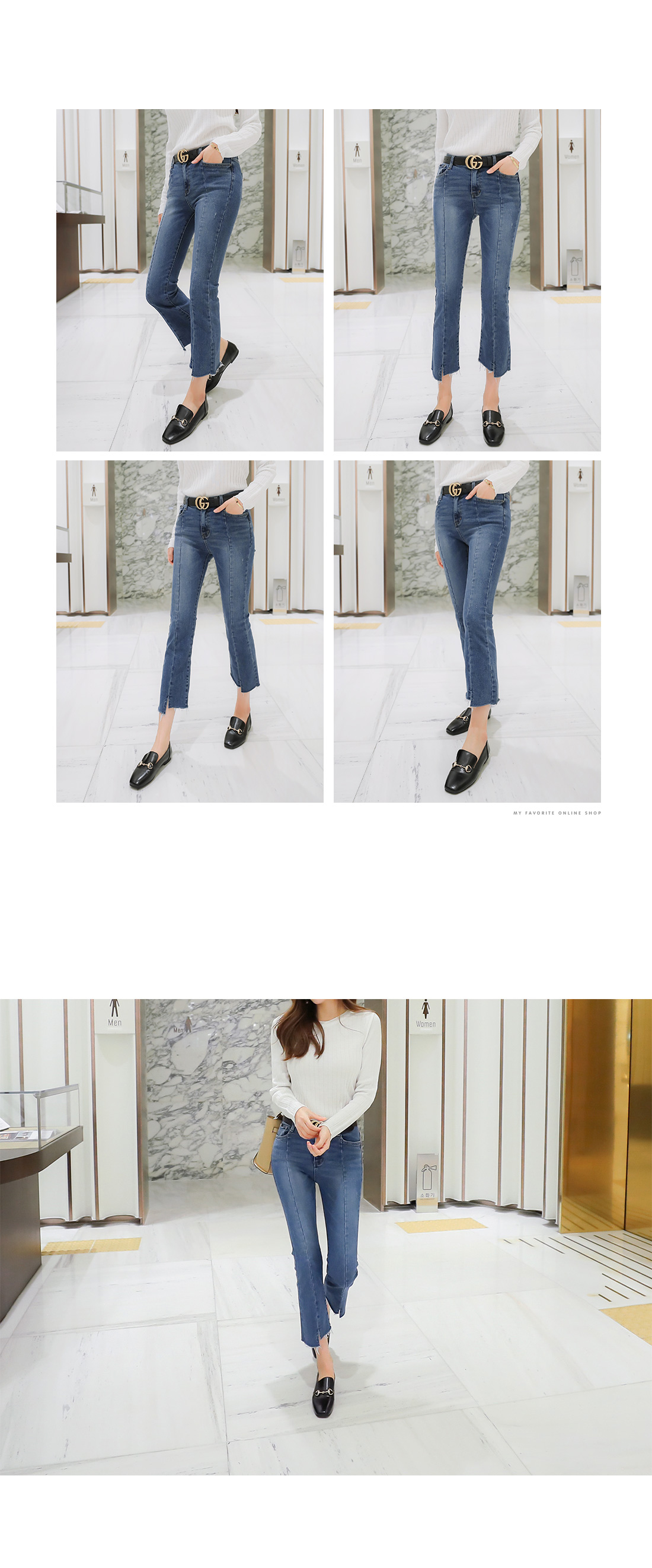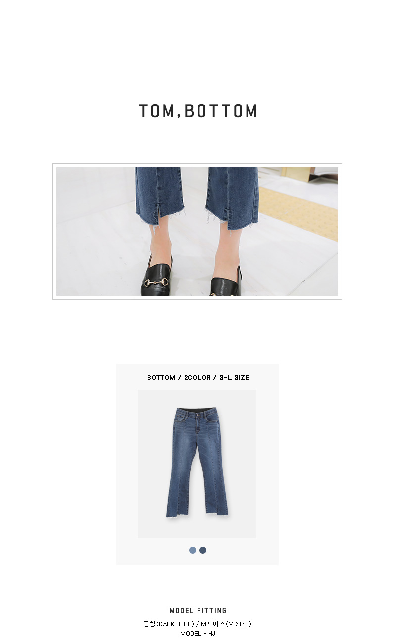 탄탄한 데님 소재로 늘어짐 걱정없이 즐길 수 있구요, 허리부터 무릎부분까지는 핏되면서 그밑으로는 자연스럽게 퍼지는 부츠컷 디자인으로 룩에 트렌디한 감각을 더해 주었는데요, 앞중심부터 절개느낌으로 연출되며 세로로 떨어지는 늘씬한핏으로 밑단에 언밸런스한 기장감과 트임을 주어 멋스러운 포인트를 더해 주었답니다!