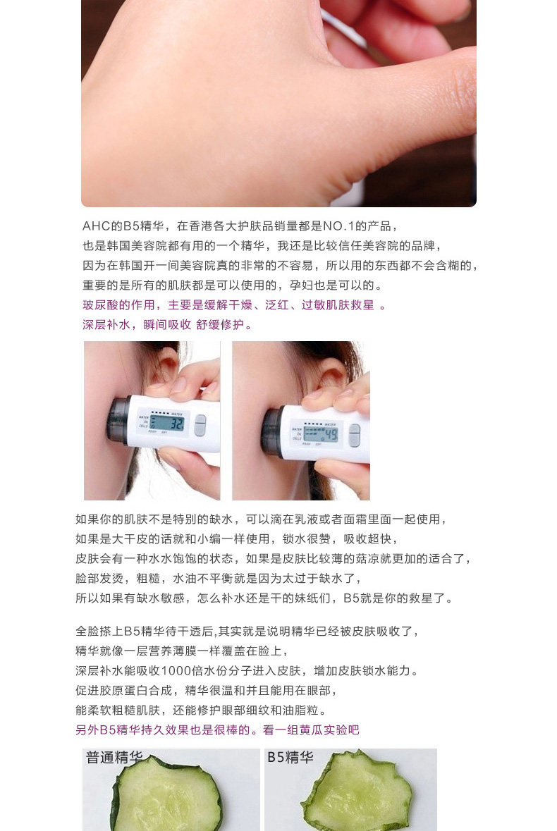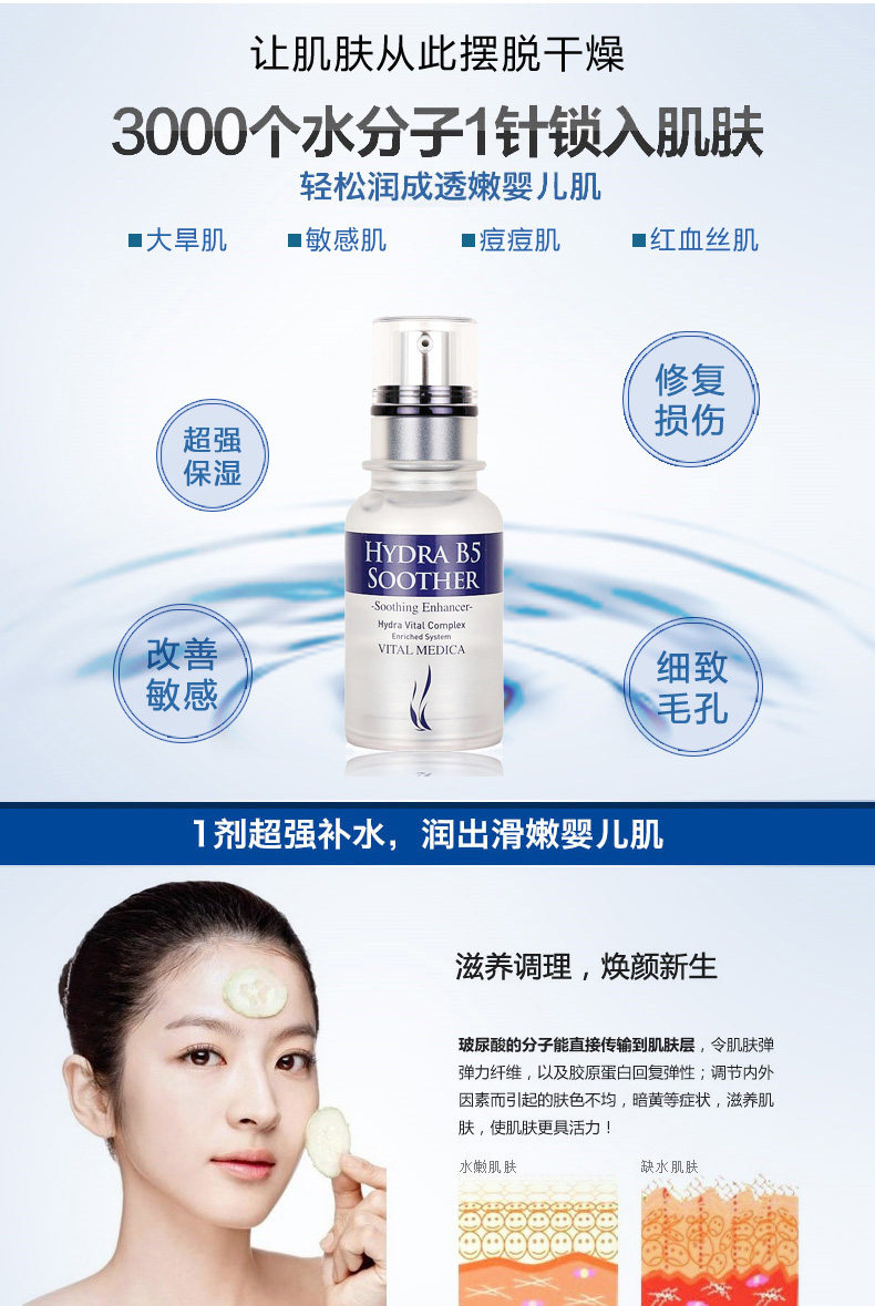 This AHC Hydra B5 Soother contains vitamin B5(Panthenol). So, it helps to <hydrate the skin by gathering moisture on the rough skin caused by dry environment. This vitamin B5 is the essence formaintenance of soft skin by making the flexible moisturizing layer on the skin.